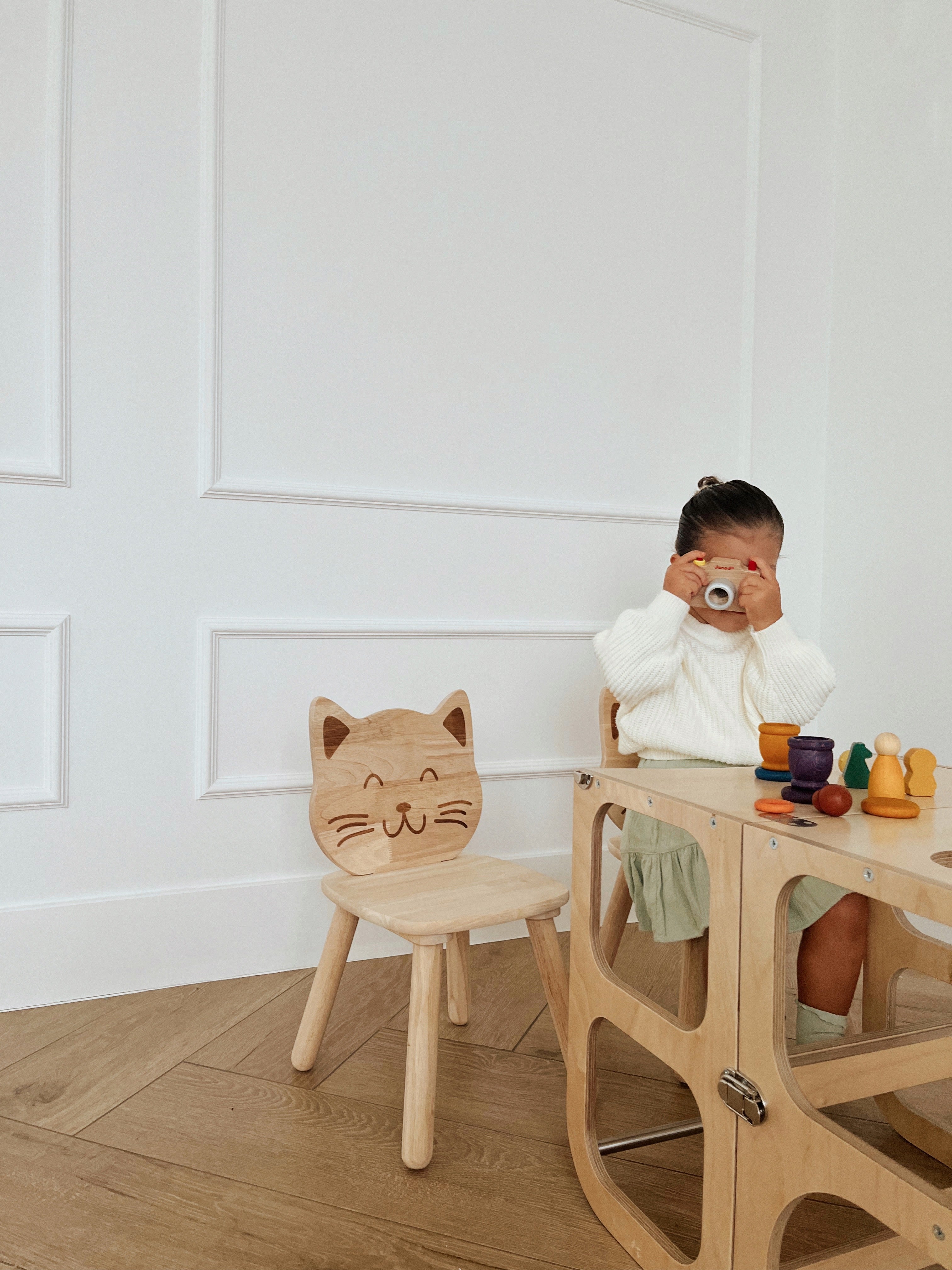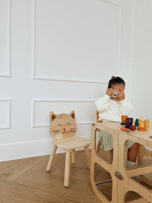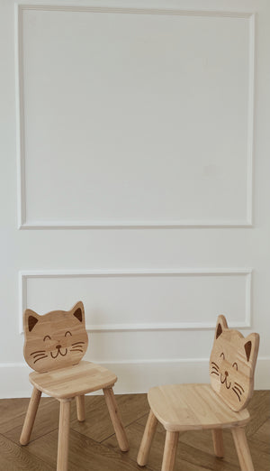 Kinderstoel die uniek zal passen in de kinderkamer. Hij is gemaakt van hout in een beige tint met een kattenpatroon. Geschikt voor gebruik binnenshuis.