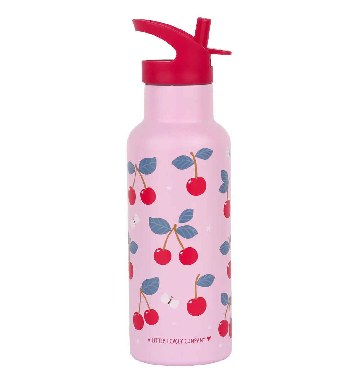 De extra grote RVS-drinkfles met kersendesign is ideaal om mee te nemen naar school. De drinkfles voor kinderen is dubbelwandig en hierdoor een ideale thermosfles. De 500 ml drinkfles wordt standaard geleverd met een drinktuit en een rietje voor koude dranken. Een RVS draaidop voor warme dranken is apart verkrijgbaar.