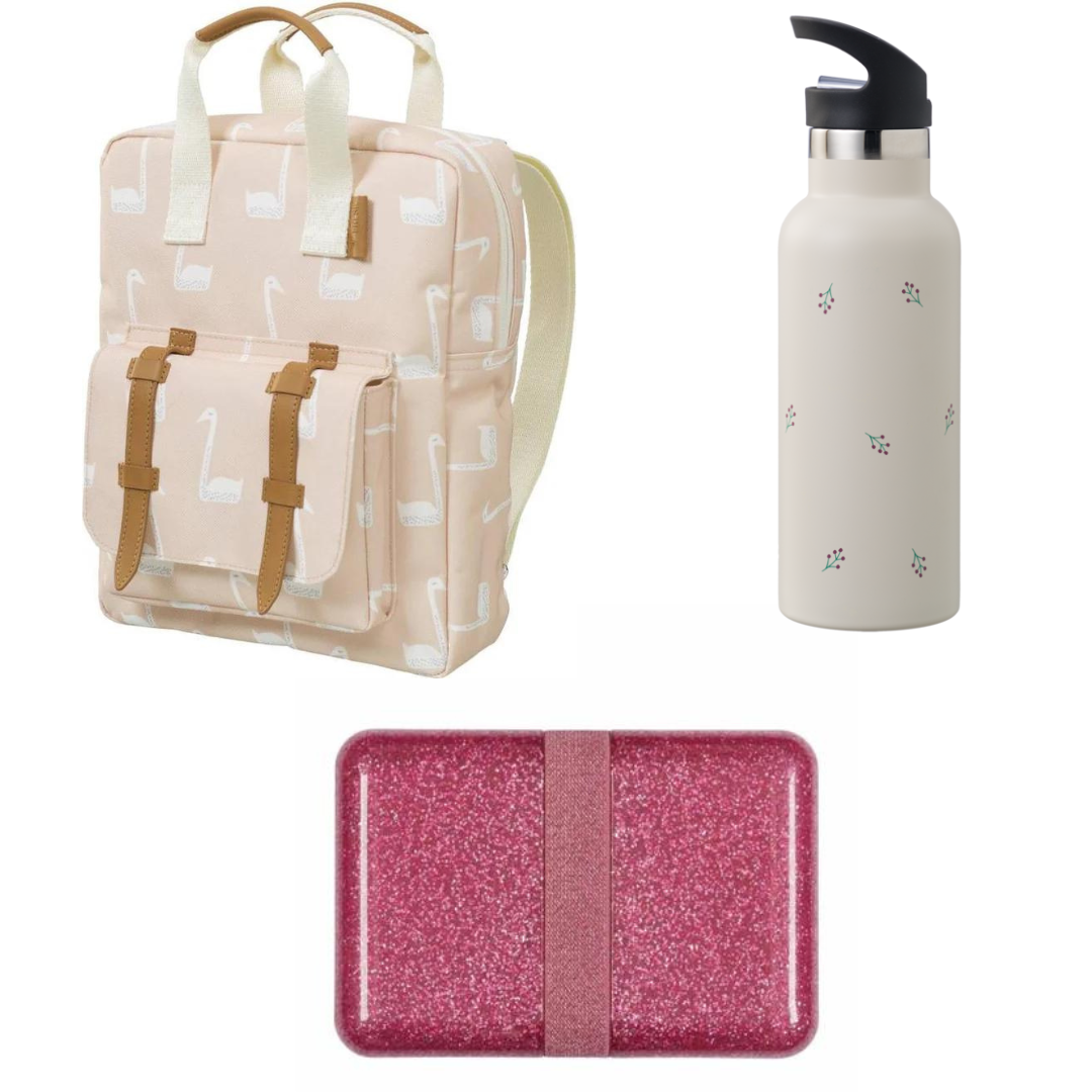 BEAU by Bo Fresk Back to School set - Rugzak Swan + Drinkfles 500ml Berries + ALLC Lunchbox Glitter Roze