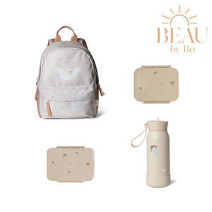 De set bestaat uit een kleuterrugzak, lunchbox, snackdoos en RVS drinkfles