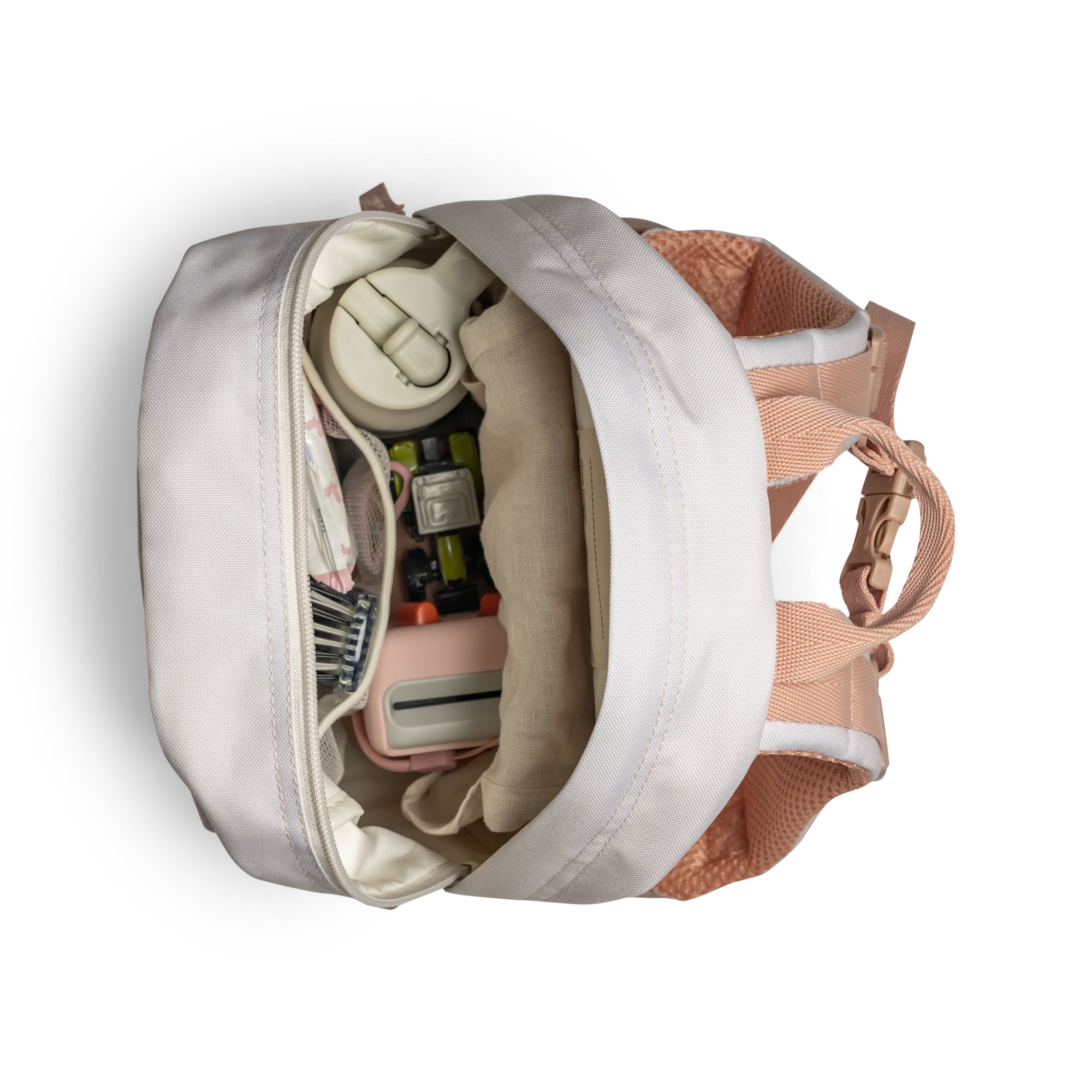 Deze kleine maar machtige minirugzak bevat meer dan genoeg voor de avonturen van je kleine kind en is gemakkelijk te gebruiken als je in de zomer op reis gaat. De rugzak heeft een hoofdvak met dubbele ritssluiting en een klein voorvak met ritssluiting, zodat er 1 waterfles van 250 ml, 1 mini roestvrijstalen snackdoos, 2 kleine speeltjes, een kinderzonnebril, vochtige doekjes, 1 kindvriendelijk accessoire en schone kleren in passen.