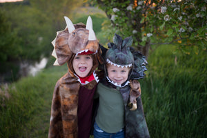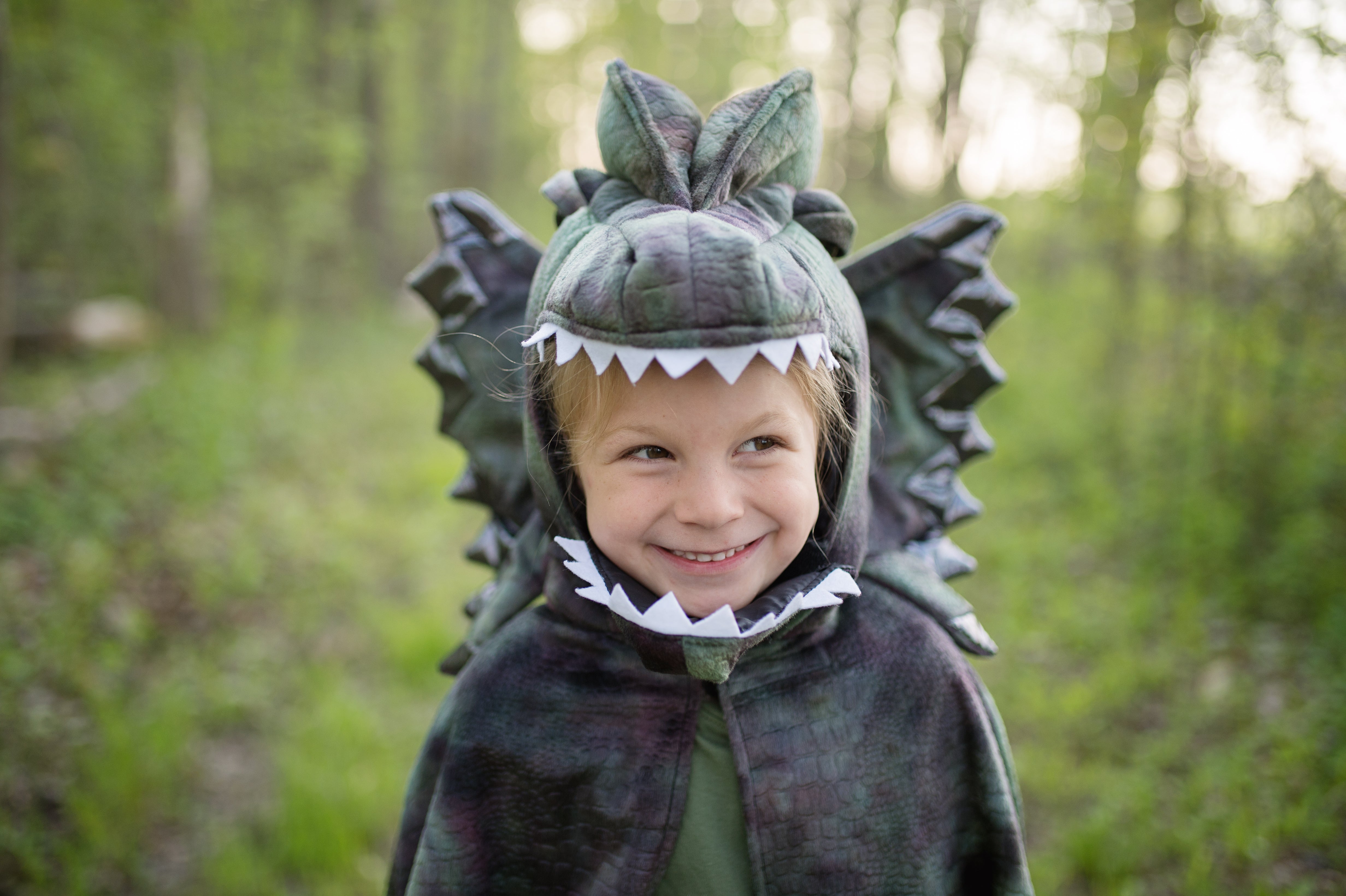 Votre Triceratops ou T-Rex a-t-il besoin d'un ami ? Votre enfant va adorer cette cape dinosaure super mignonne et monstrueuse ! Cette cape tie-dye verte, grise et violette est doublée d'une doublure noire. Détaillé avec des pointes métalliques grises et violettes au dos. La tête de dinosaure est dotée d'un embout amovible pour un ajustement parfait. Il s'agit d'un ensemble de deux pièces – cape et griffes incluses.