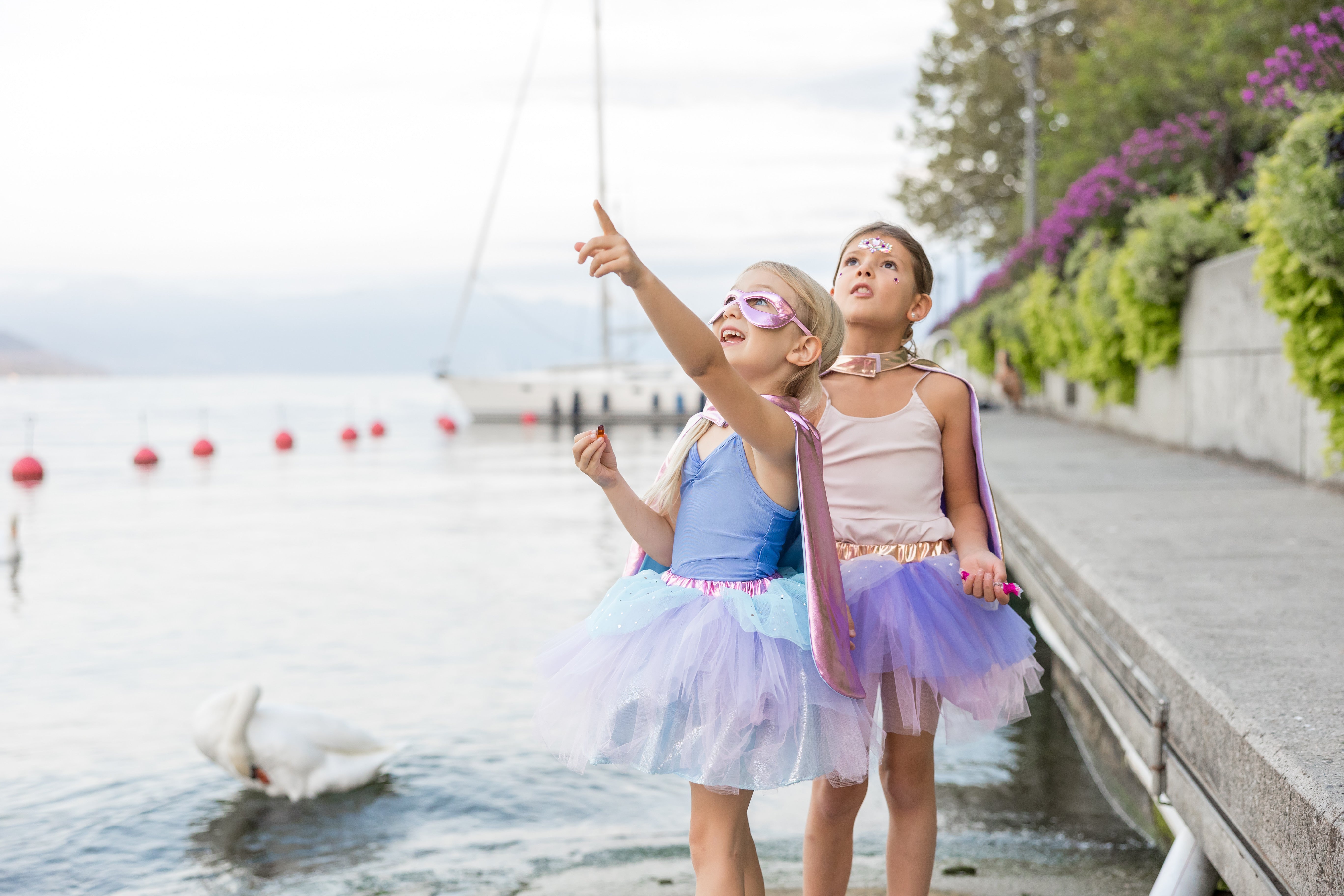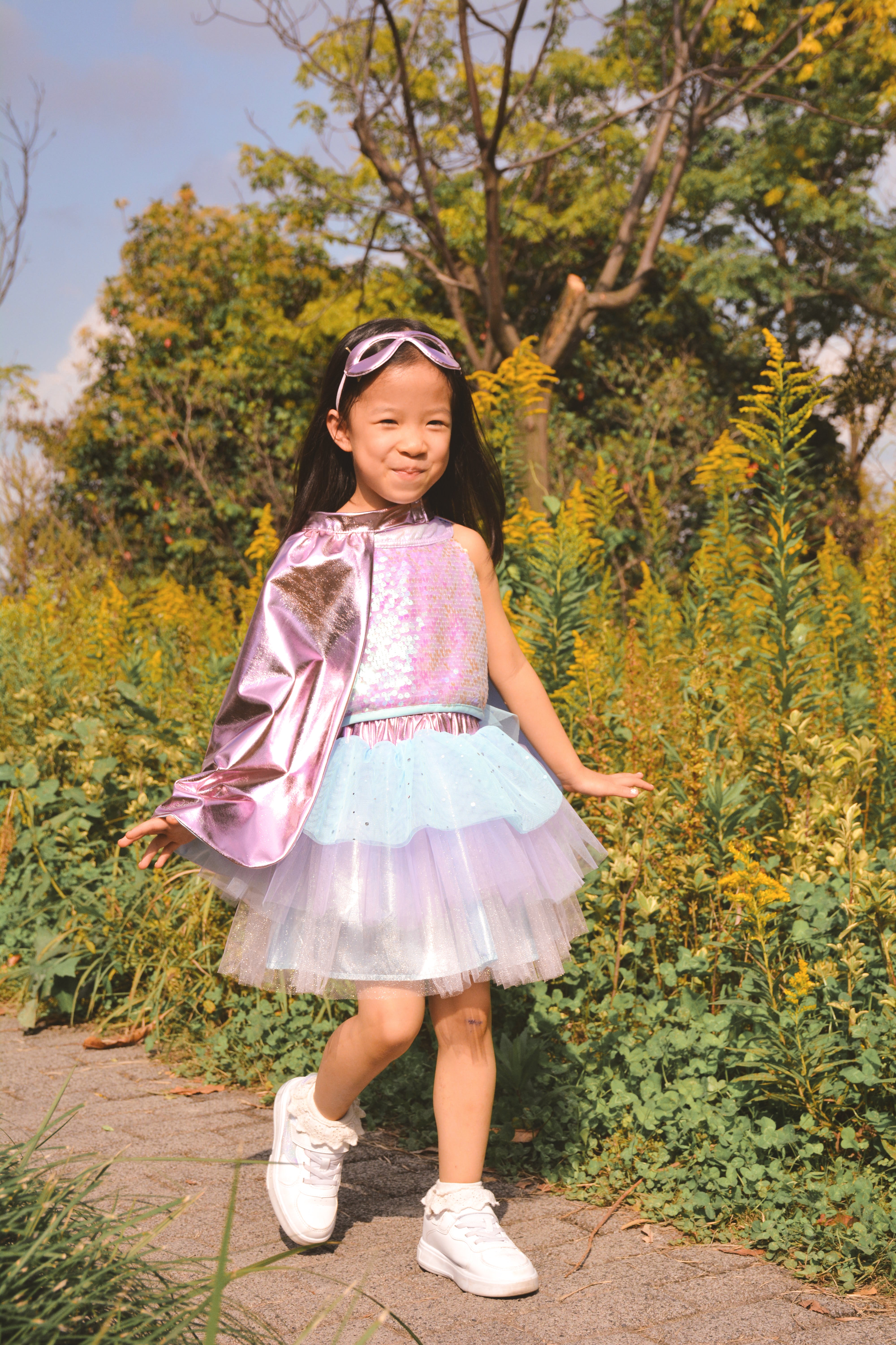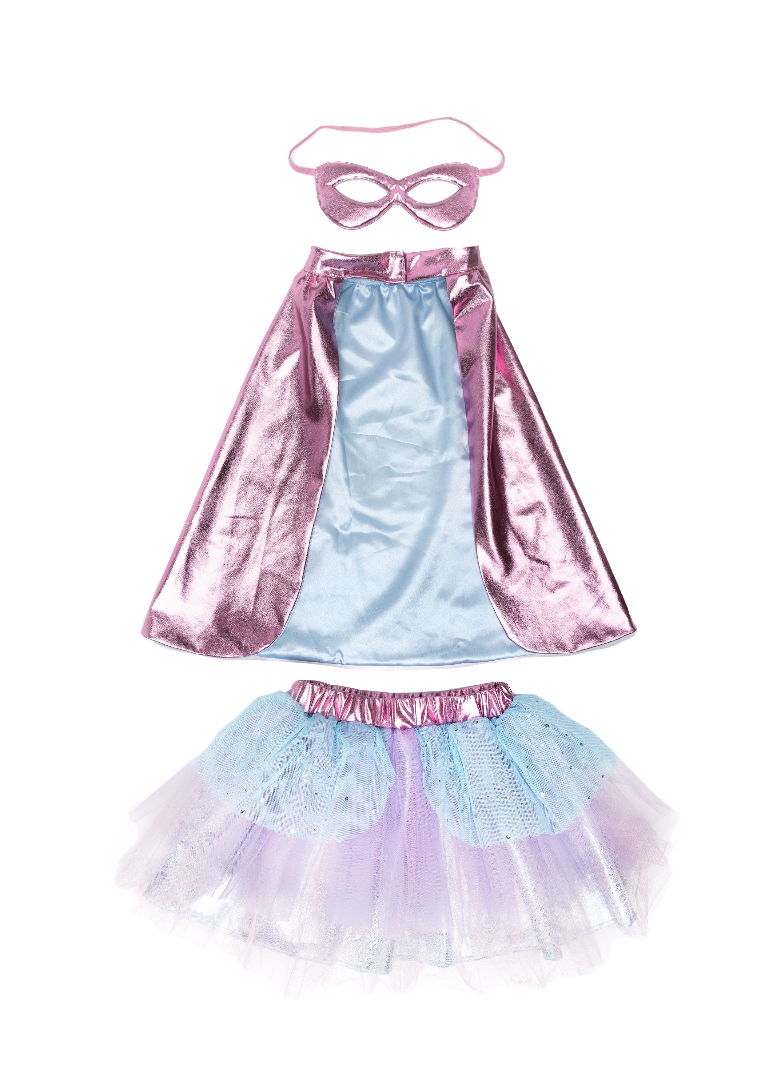 Libérez le super-héros qui sommeille en votre enfant avec notre ensemble Super-Duper Tutu, Cape et Masque en rose métallisé et bleu clair enchanteurs ! Cet ensemble est un éclat de couleurs magiques et de jeu imaginatif.