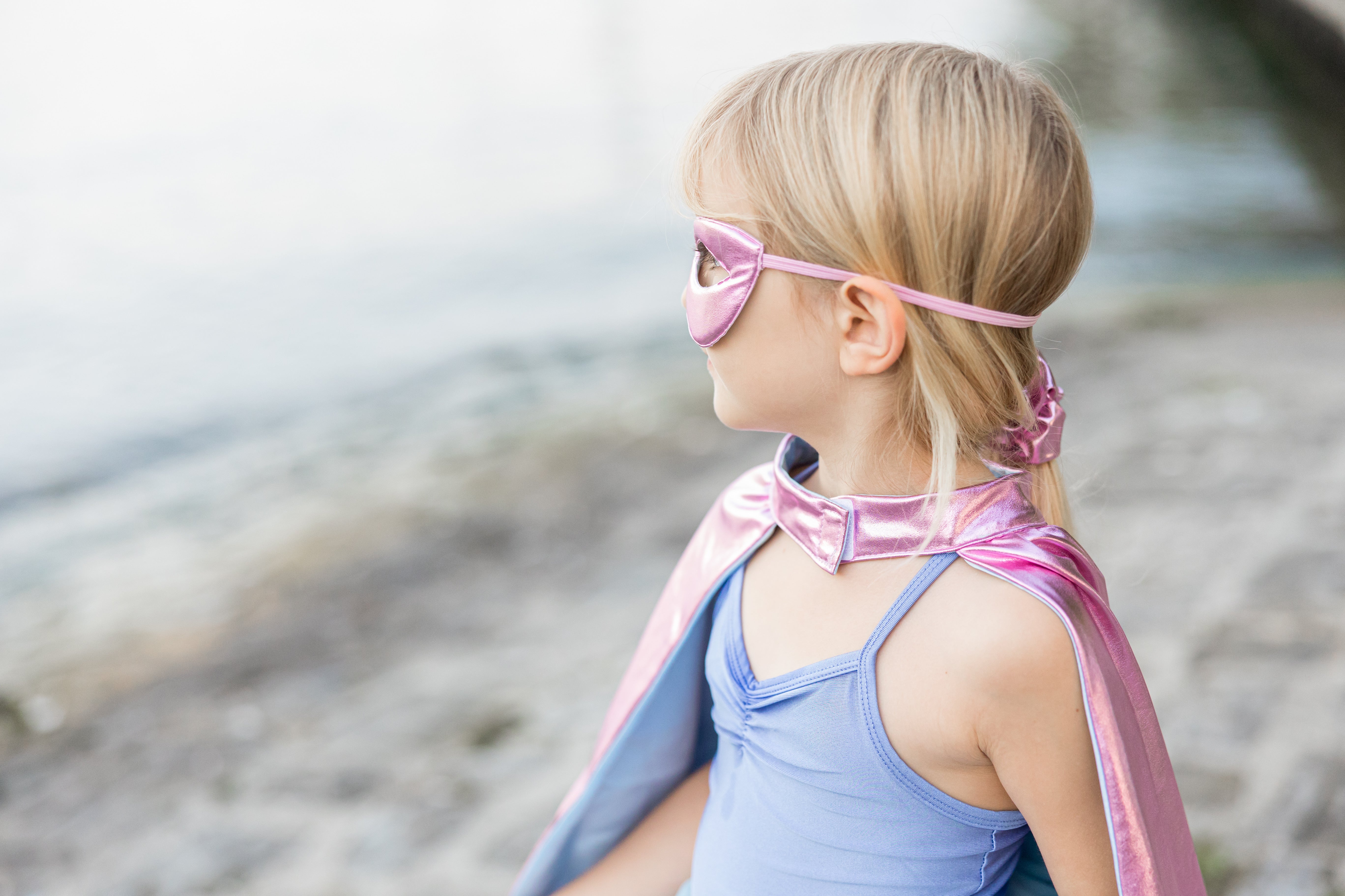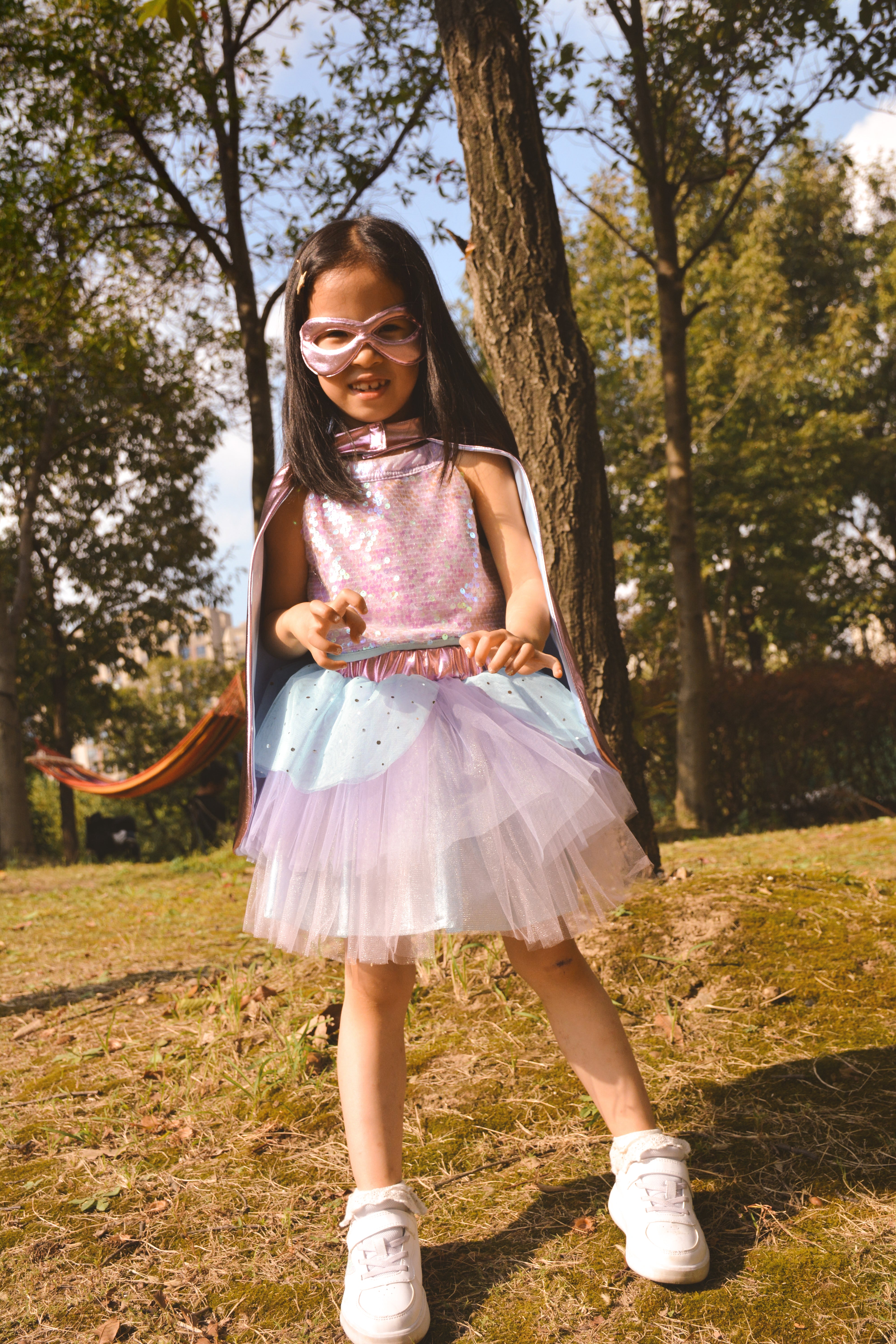 La cape rose métallisé, doublée d'un magnifique satin bleu, ondule avec une élégance de super-héros, faisant ressortir chaque petit héros. Le masque pour les yeux rose métallisé assorti ajoute une atmosphère mystérieuse, parfaite pour cacher l'identité secrète.