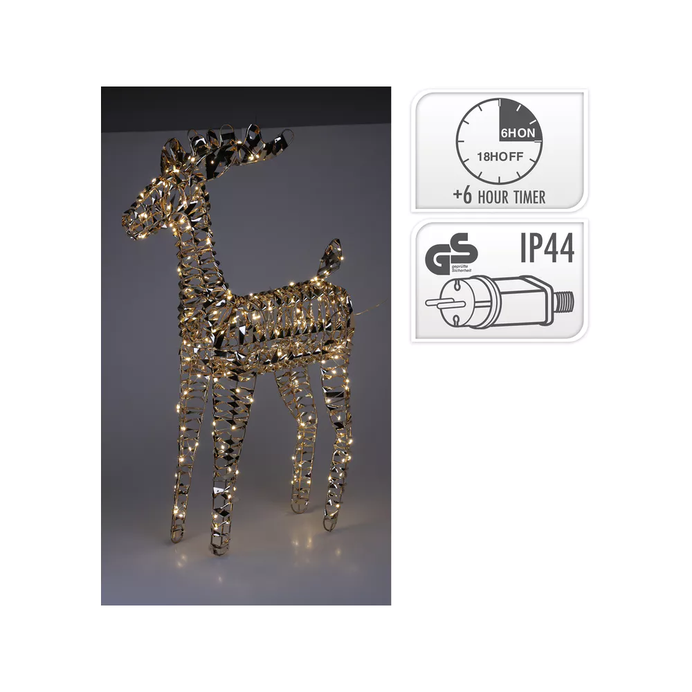 Dit prachtige gouden rendier van 80 cm is een betoverende decoratie voor de feestdagen. Met zijn micro LED-verlichting straalt het rendier een warme gloed uit, waardoor het een sfeervolle aanvulling is op je kerstdecoratie. Het rendier werkt via een IP44 adapter, waardoor je deze gemakkelijk ook buiten kunt plaatsen. Dankzij de handige 6-uurs timer schakelt het rendier automatisch in en uit, zodat je moeiteloos kunt genieten van de sprankelende verlichting.