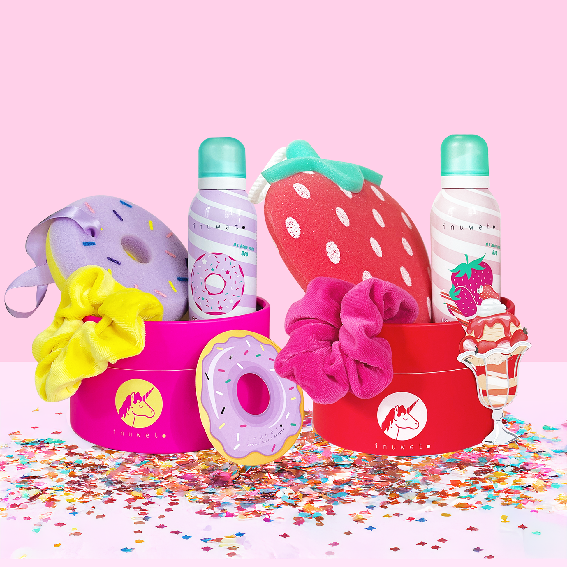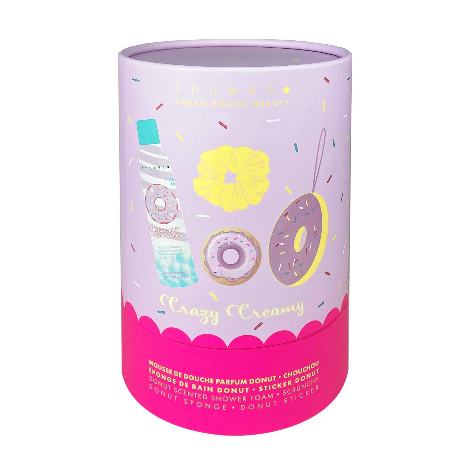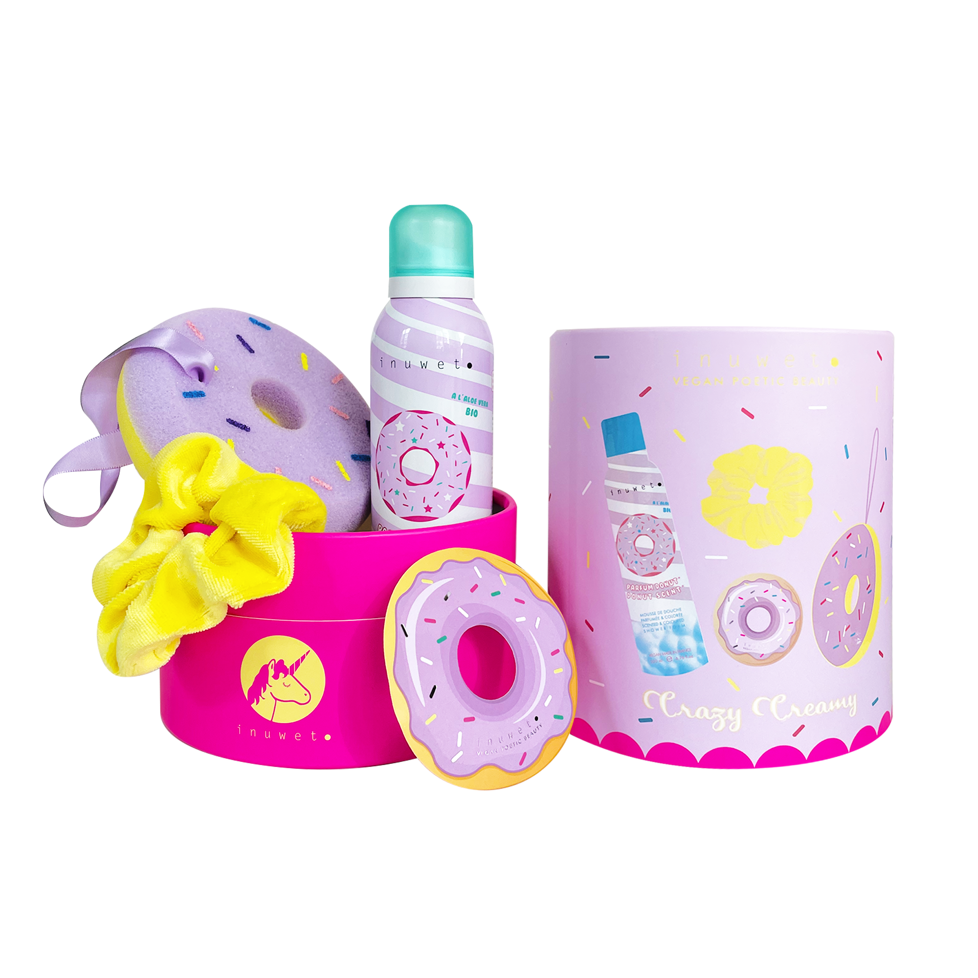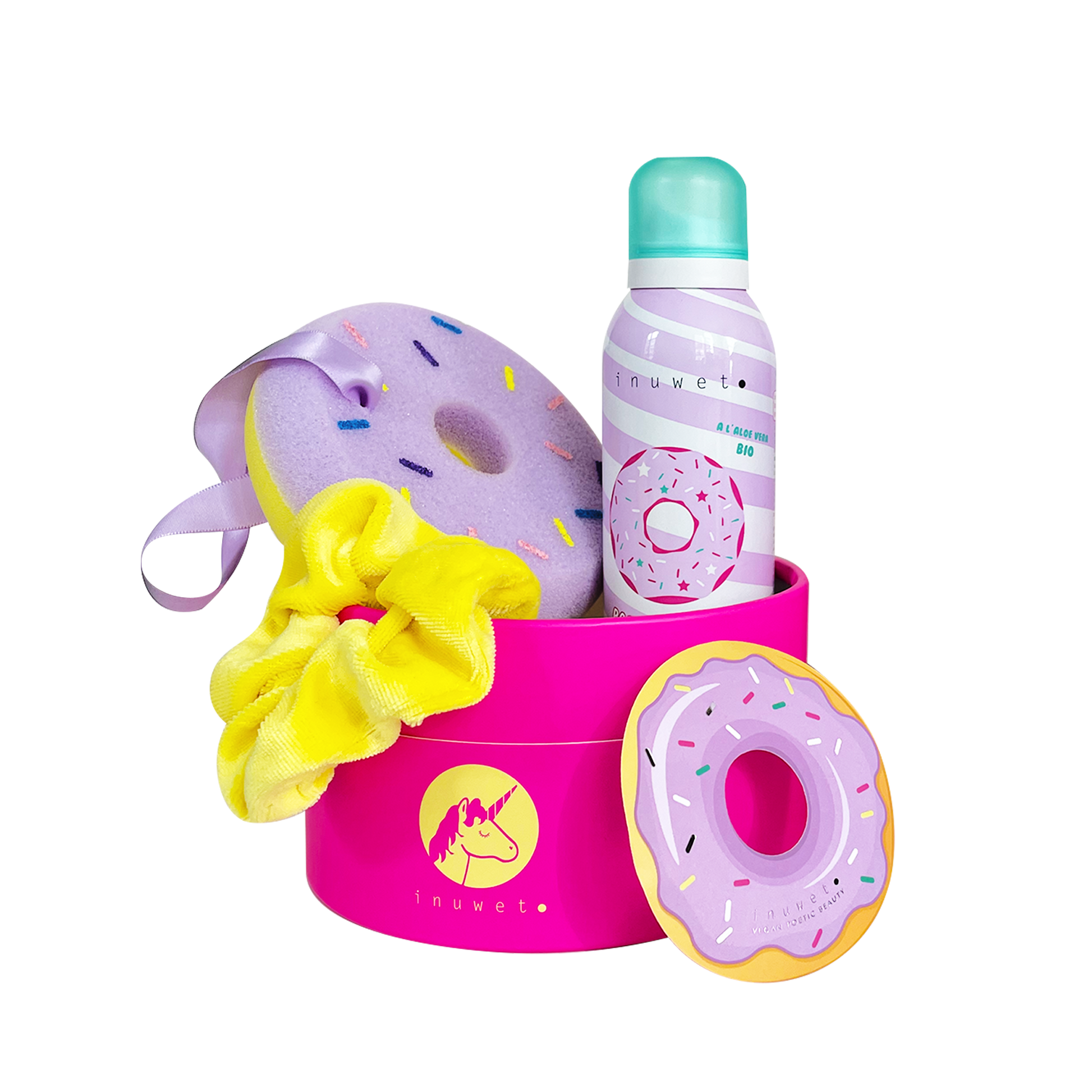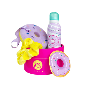 Een doucheschuim met een heerlijke donutgeur en 2 accessoires: een spons in de vorm van een donut en een scrunchie met een donutsticker.