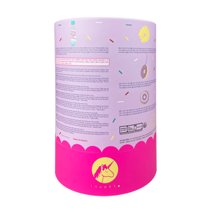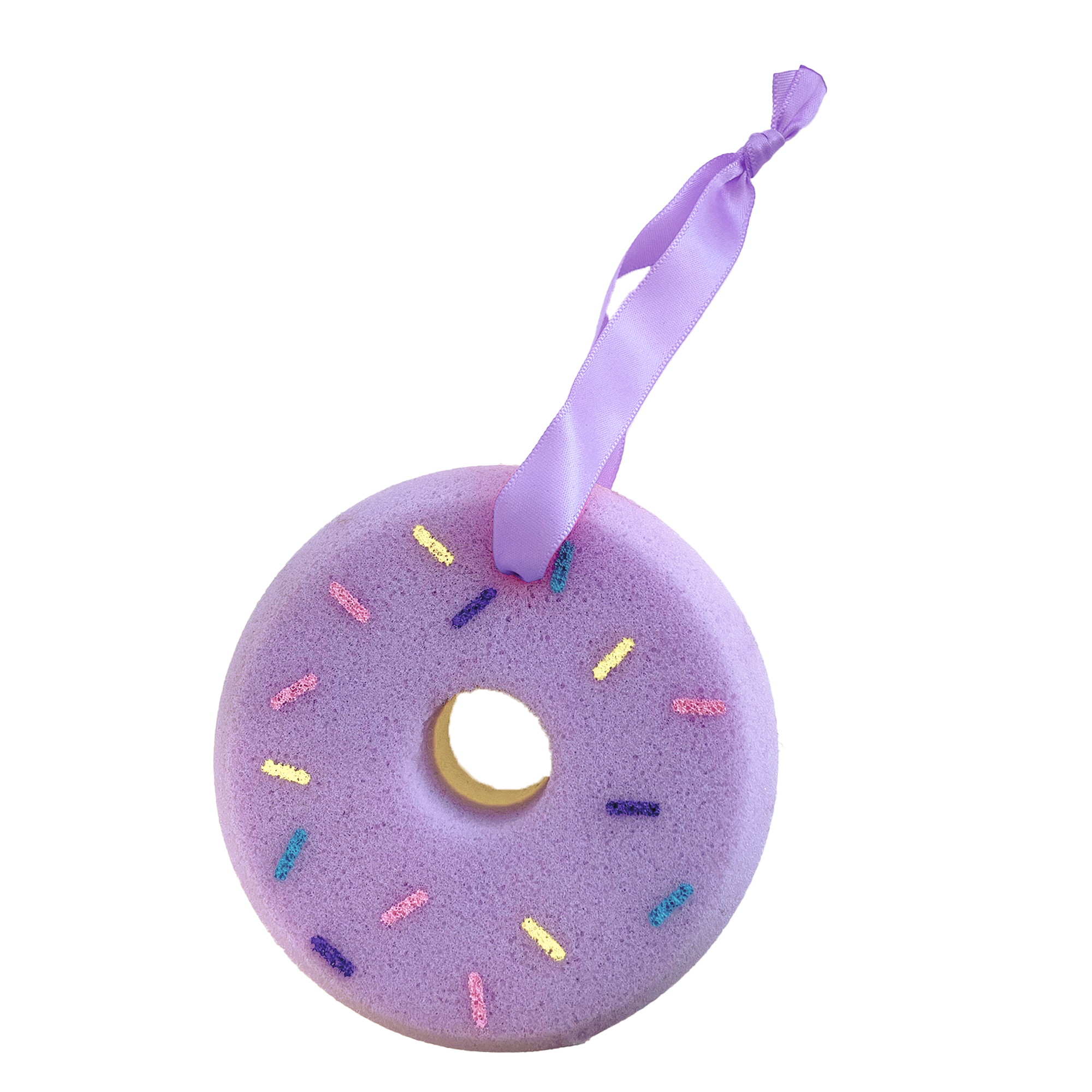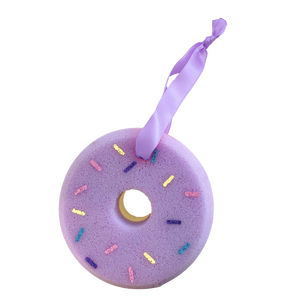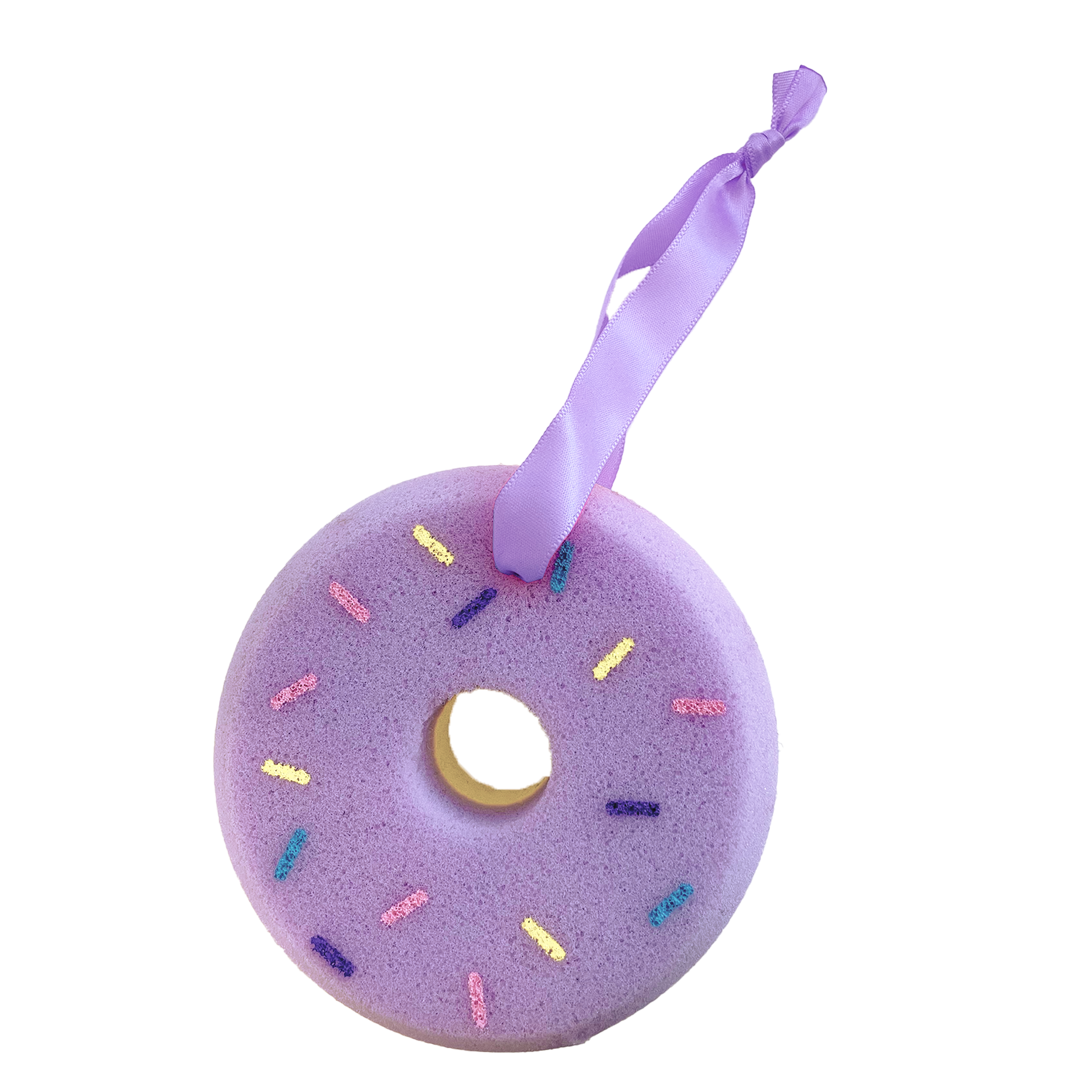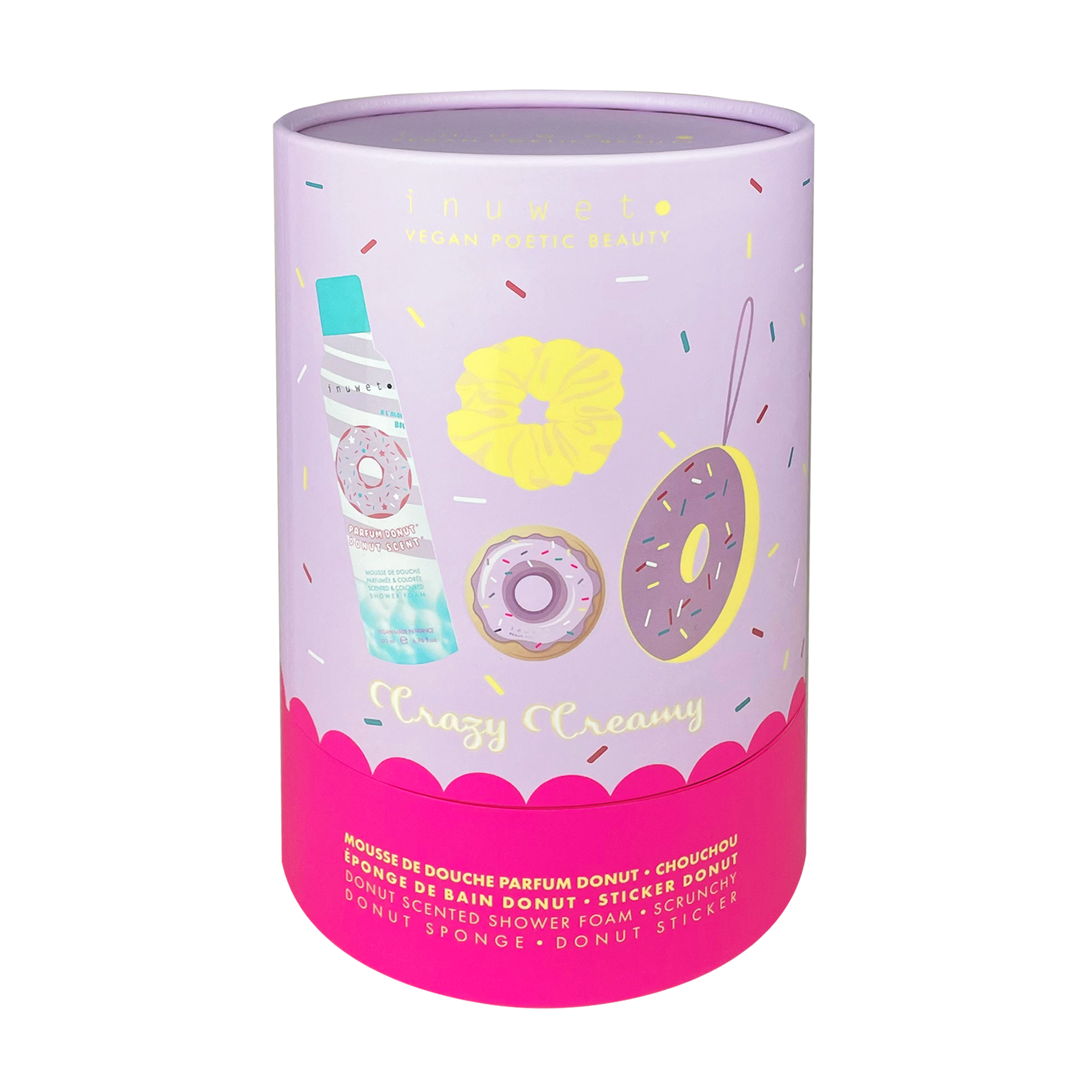Een doucheschuim met een heerlijke donutgeur en 2 accessoires: een spons in de vorm van een donut en een scrunchie met een donutsticker.