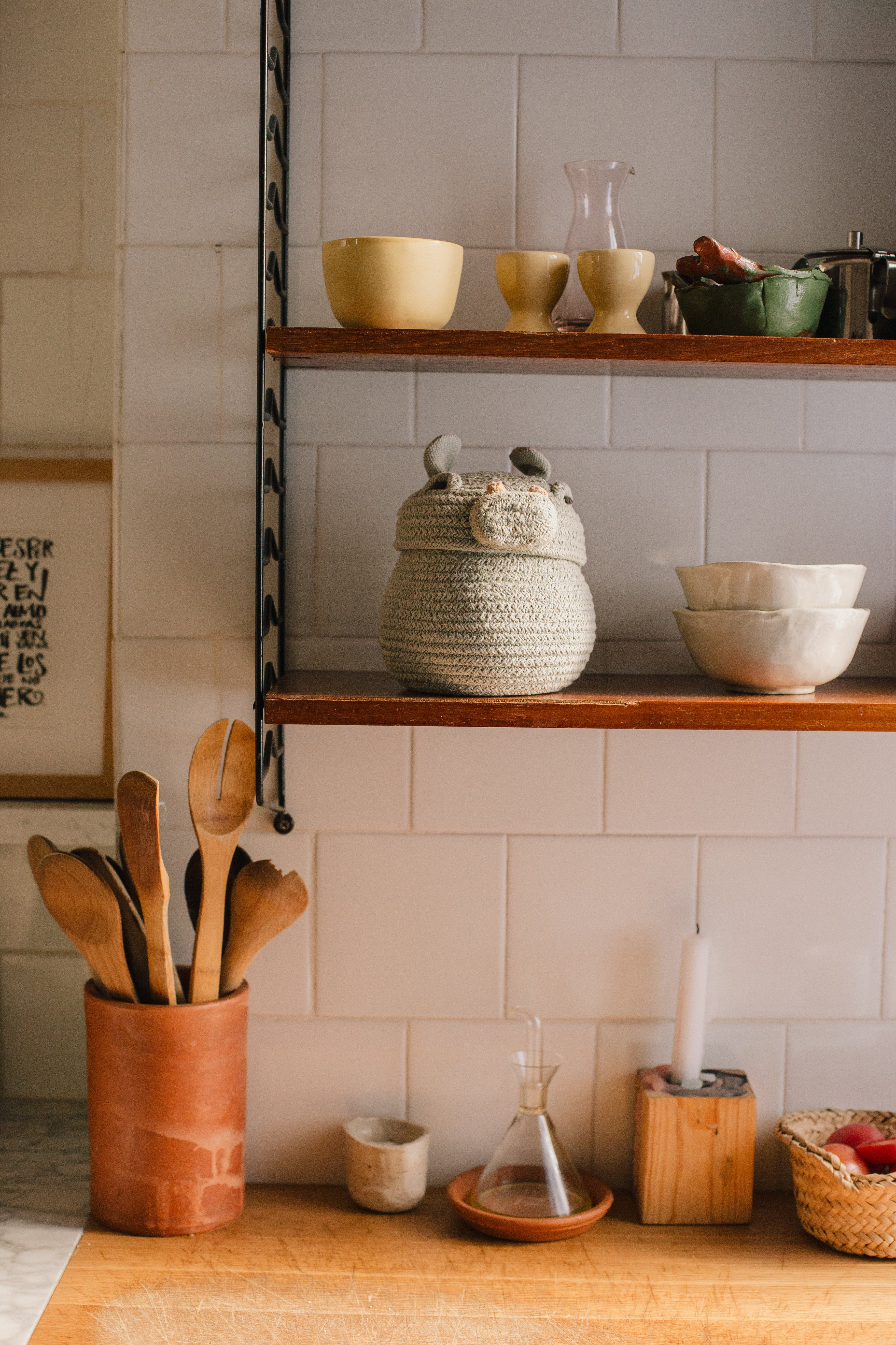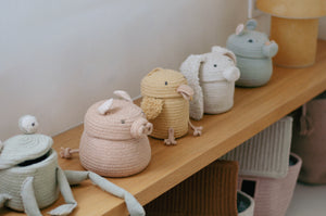 Une mini version de notre populaire panier Henri l'Hippopotame ! Fabriqué avec soin à partir de chutes et fait à la main avec des cordons de coton tressés en sauge bleue mélangés à des fibres provenant de bouteilles PET recyclées. Le mini panier d'Henri l'hippopotame possède un grand nez rond avec des narines roses et des oreilles en toile pliées. Un panier pratique qui s'adapte à votre étagère et cache bien vos petits trésors.