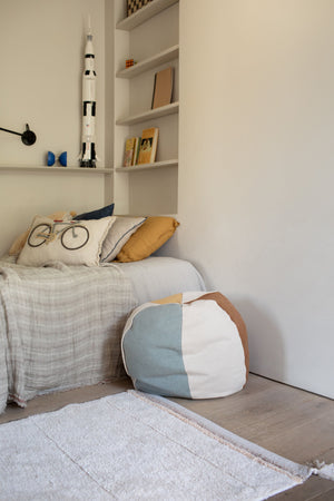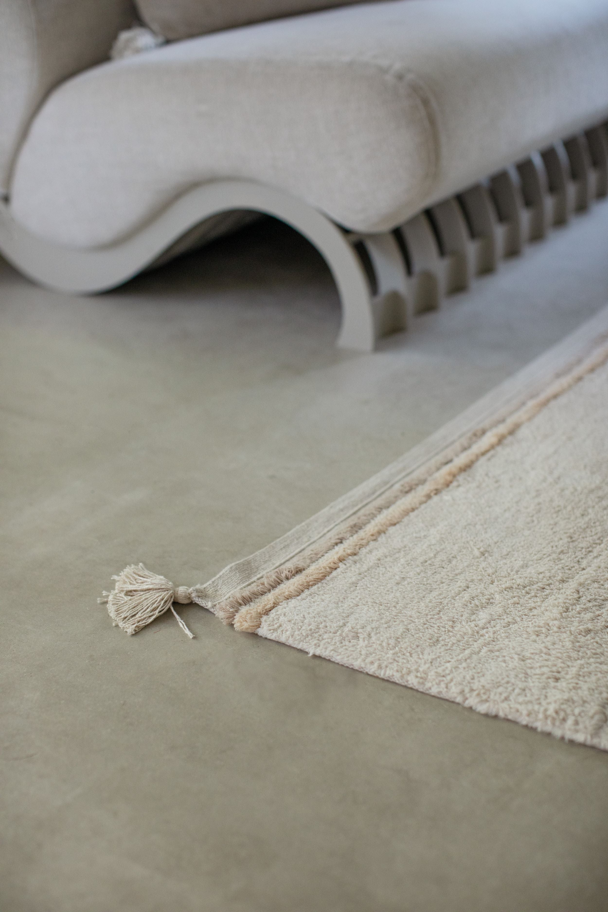 Un élégant tapis uni avec un poil court en coton doux et de jolis pompons pour une ambiance légèrement bohème. Ce design est une extension de la collection RugCycled®, où notre production est zéro déchet. Combinez-le avec diverses pièces de notre collection Fantasy Garden pour une décoration thématique dans la chambre de bébé, ou utilisez-le seul dans le reste de la maison car il s'intègre facilement dans n'importe quelle pièce grâce à ses couleurs neutres et douces. Ce tapis en coton lavable est disponible en trois couleurs, du coton beige naturel non teint au rose brossé et jaune doré. Vous pouvez choisir parmi différentes tailles et voir celle qui convient le mieux à votre espace. Le design présente une surface touffetée unie avec des hauteurs de poils subtilement variables qui ajoutent une texture rayée. Les bords sont finis en toile nue avec des rayures brodées contrastées et un pompon à chaque coin. Nous vous recommandons d'utiliser une sous-couche antidérapante pour maintenir le tapis en place.
