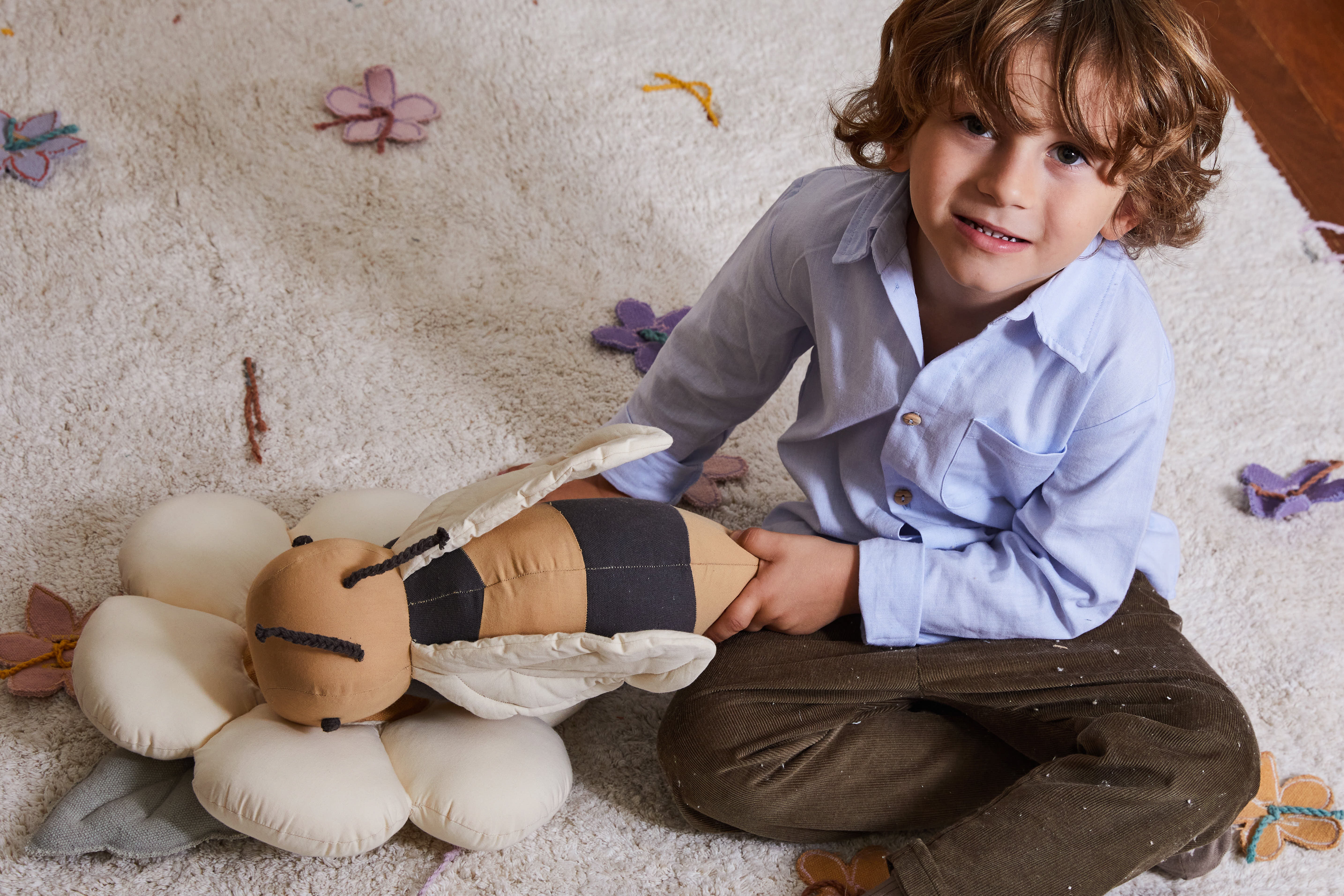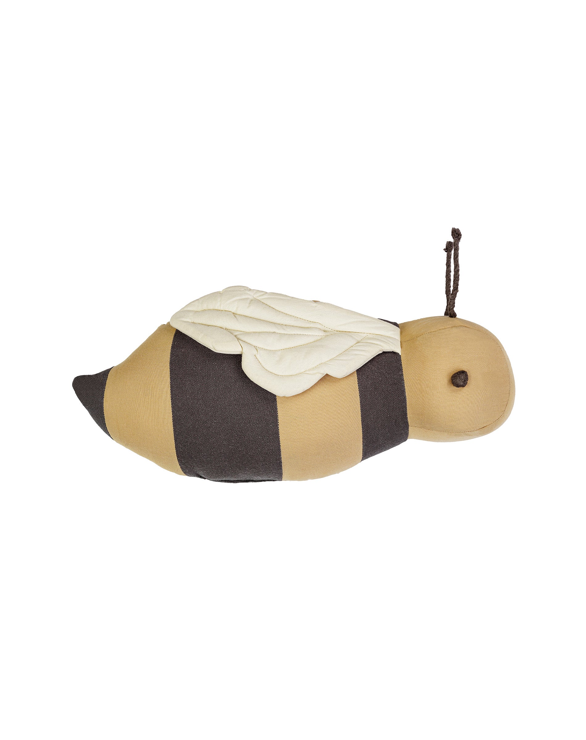 Le coussin Buzzy Bee est un coussin décoratif tout doux en forme d'abeille. Il est réalisé en popeline de coton douce de couleur miel avec des rayures gris foncé et des ailes légèrement doublées de couleur naturelle. Des tresses faites à la main gris foncé forment les antennes.