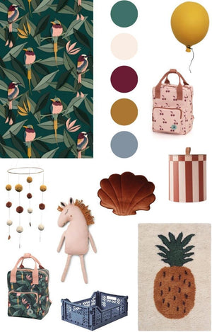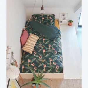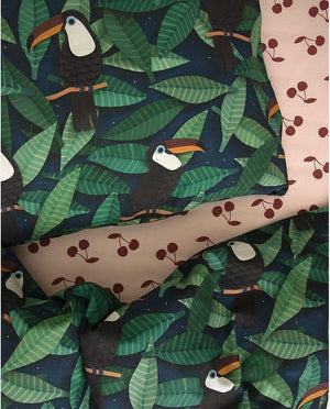 Studio Ditte - housse de couette junior avec des oiseaux élégants cachés entre des feuilles et des fleurs gracieuses. L’impression est nette sur du coton doux. Le dos de la couverture est d’un beau vert foncé.