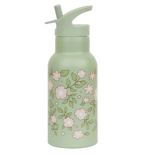 Bouteille thermos à double paroi d'acier inoxydable avec des fleurs. La bouteille est standard avec un bouchon de virage, une boisson et une paille pour les boissons froides.