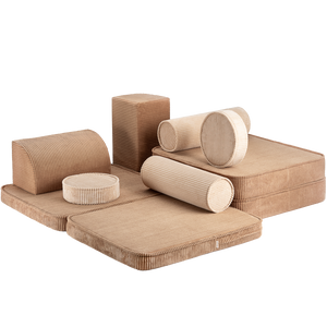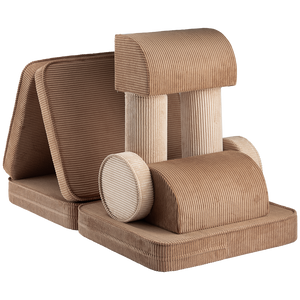 Le canapé Wigiwama se compose de 9 parties - deux coussins d'assise, un grand coussin d'assise, deux coussins triangulaires comme dossier, deux coussins à roulettes comme accoudoir et deux coussins ronds - et offre une combinaison parfaite avec des possibilités illimitées de jeu imaginatif et de détente.