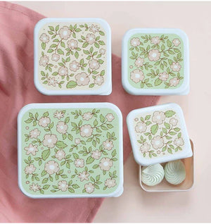 Set van vier lunch- en snackdozen in vier verschillende maten, met allerlei bloementjes. Door het lipje aan de zijkant van het deksel zijn ze gemakkelijk te openen en te sluiten en de doosjes stapelen in elkaar om ze gemakkelijk op te bergen.