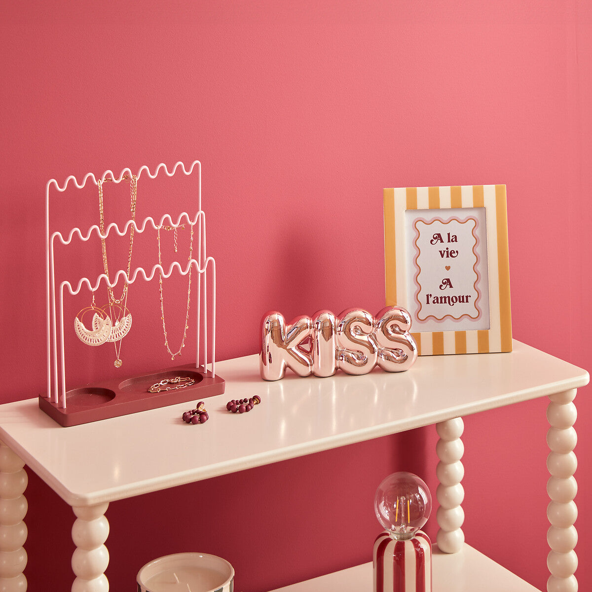 Deze speelse juwelenhouder in roze en bordeaux is de perfecte mix van fun en functionaliteit! Hang je favoriete oorbellen en kettinkjes overzichtelijk op aan de golvende rekjes en gebruik het bakje onderaan voor ringen of armbandjes. Ideaal voor op je kaptafel of nachtkastje!