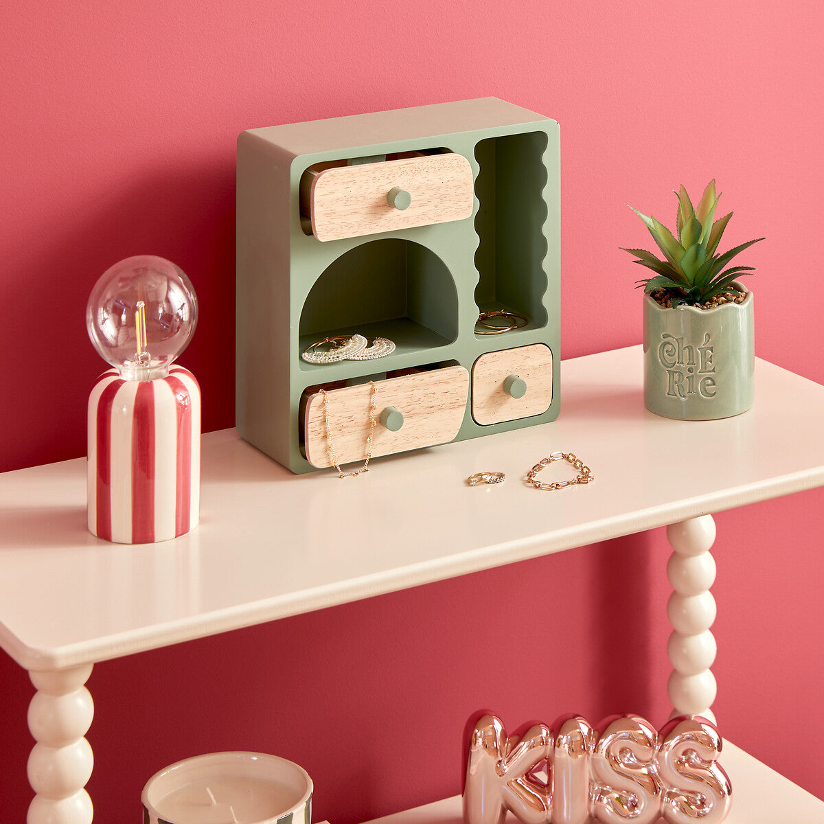 Voeg speelse opbergruimte toe met dit charmante ladekastje! Met zijn unieke vormen, drie handige lades en open vakjes is het perfect voor het opbergen van kleine spulletjes, sieraden of bureau-accessoires. Verkrijgbaar in twee frisse kleuren – ideaal voor op een bureau, commode of nachtkastje.