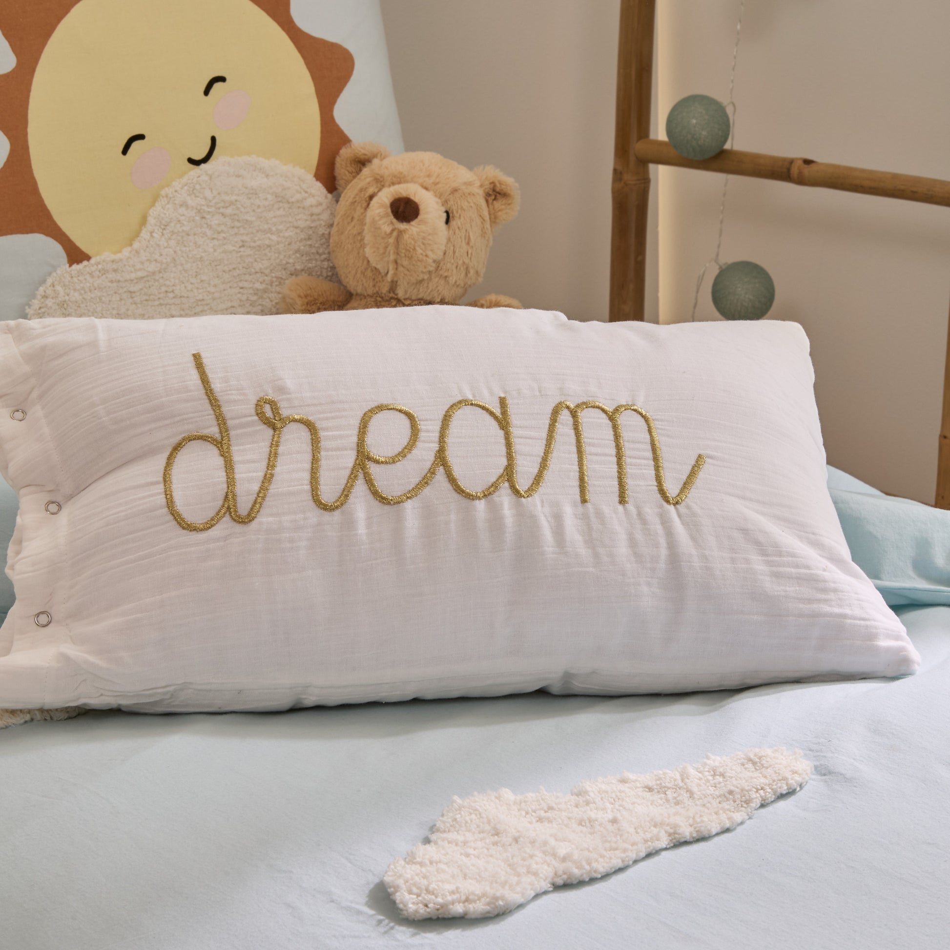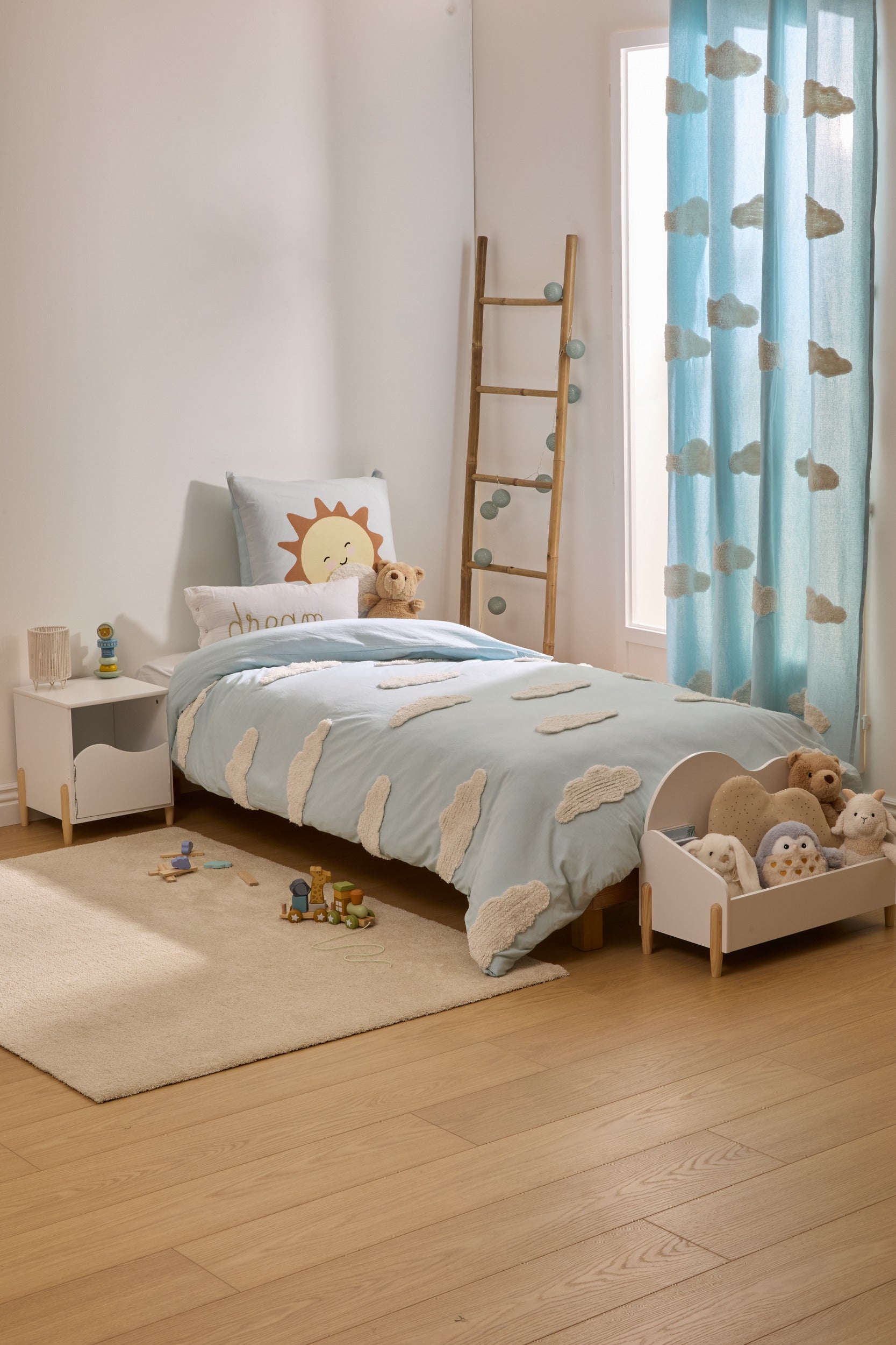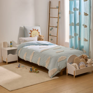 Dit dromerige beddengoed met wolkjes creëert een rustgevende en gezellige sfeer in de kinderkamer. Gemaakt van zacht materiaal voor een comfortabele en heerlijke nachtrust.