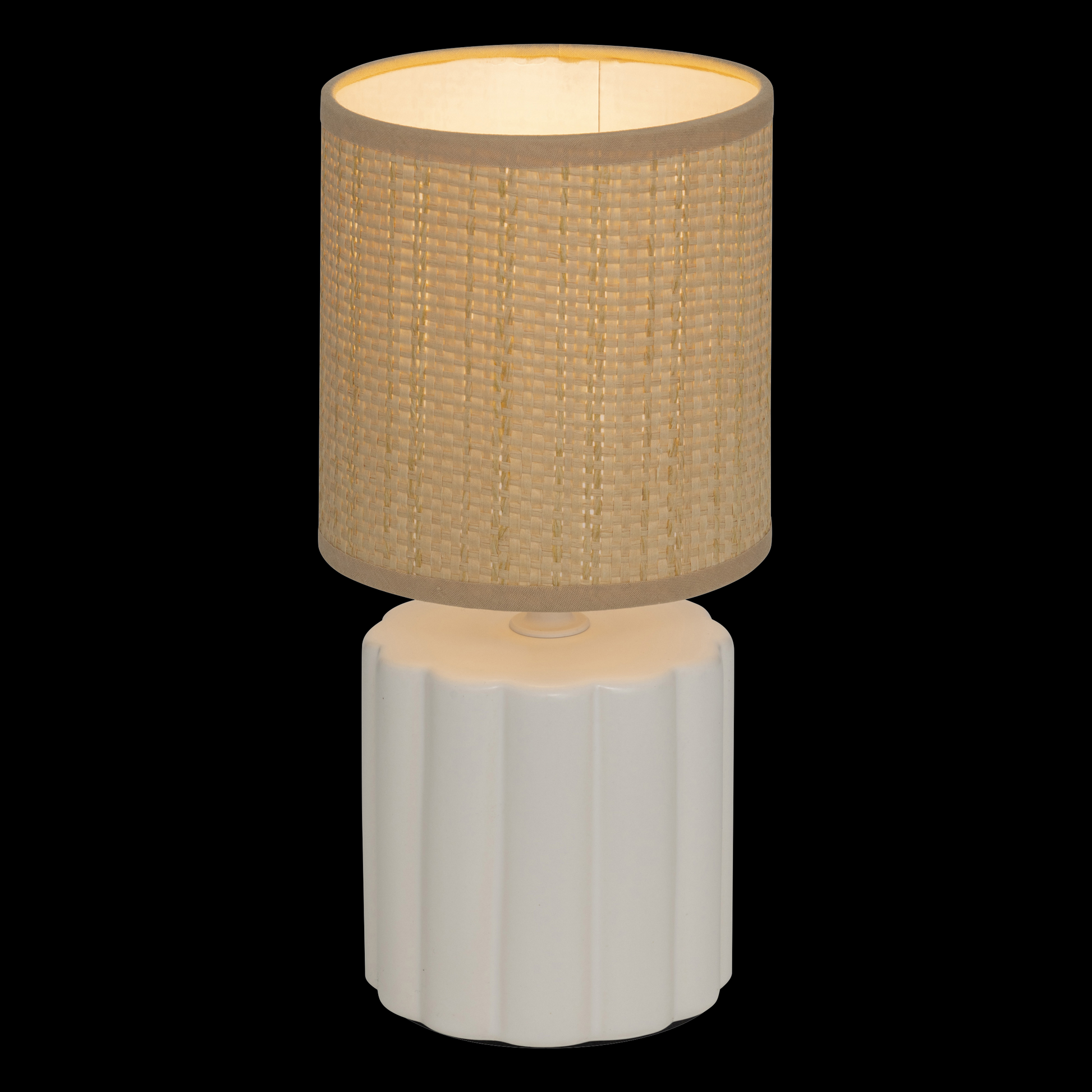Deze tafellamp straalt pure rust uit met haar natuurlijke kap en witte, geribbelde voet.