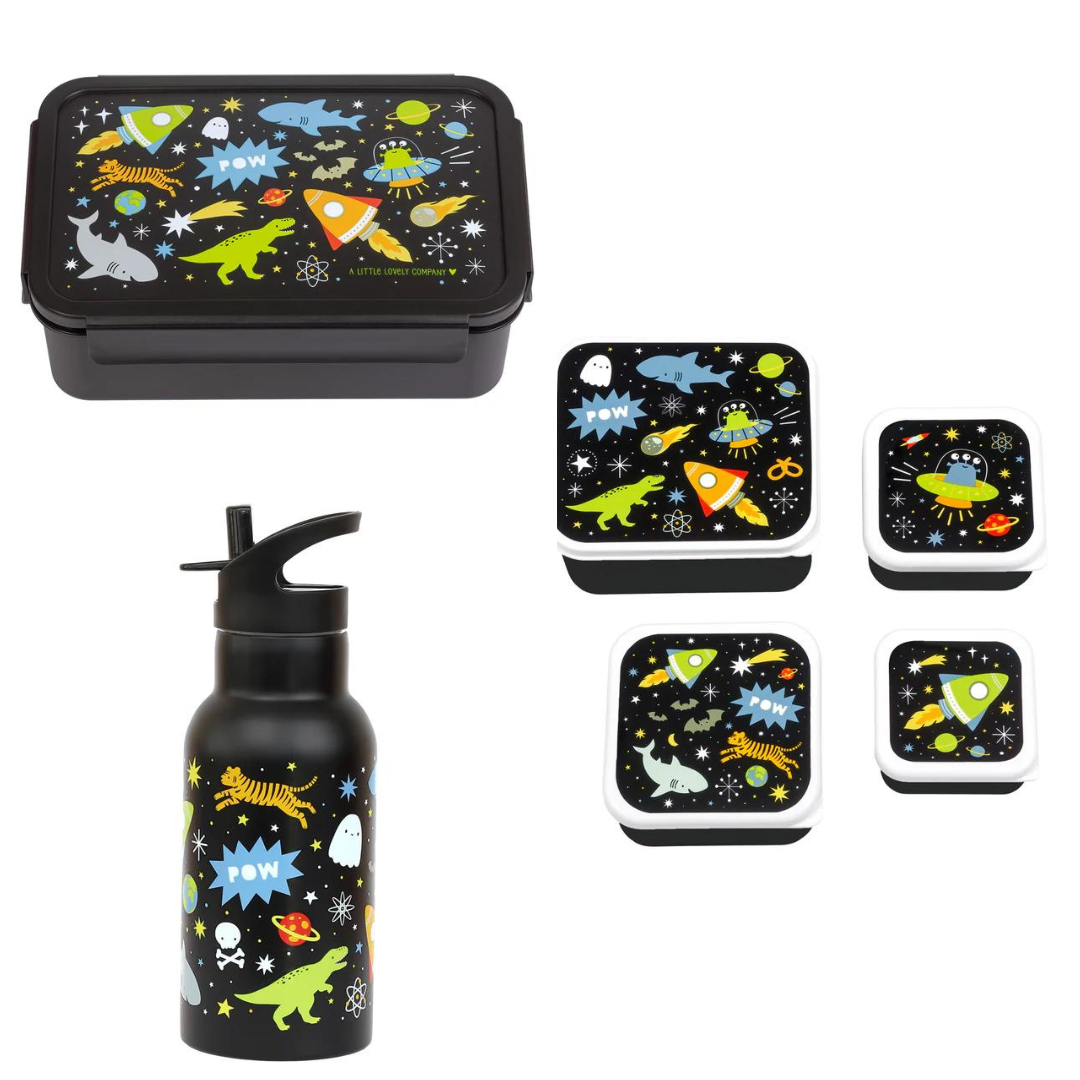 Deze zwarte lunch & snack box set met raketten, planeten en sterren is ideaal om mee te nemen naar school of onderweg. De set bestaat uit vier boxen in verschillende maten. Hierdoor zijn ze gemakkelijk in elkaar te stapelen en op te bergen.