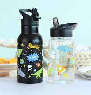 De RVS-drinkfles met raketten, planeten en sterren is ideaal om mee te nemen naar school. De drinkfles voor kinderen is dubbelwandig en hierdoor een ideale thermosfles. De 350 ml fles wordt standaard geleverd met drinktuit en rietje voor koude dranken. Een RVS draaidop voor warme dranken is apart verkrijgbaar.