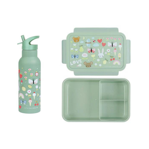 Drinkfles met bloemetjes, konijntjes en aardbeien is ideaal om mee te nemen naar school. De drinkfles is dubbelwandig en hierdoor te gebruiken als thermosfles. De drinkfles wordt standaard geleverd met een draaidop, drinktuit en een rietje voor koude dranken. Een stalen draaidop (zonder rietje) voor warme dranken is apart verkrijgbaar.