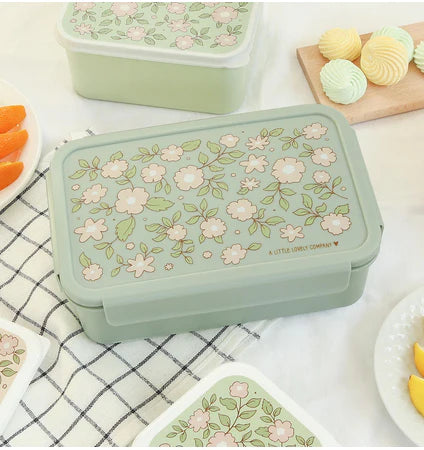 Ruime bentobox met saliegroene bloemen print. De luchtdichte click & close deksel en uitneembaar bento bakje met twee vakken zorgt voor een perfect georganiseerde lunch. Een ideale trommel voor een verse en gevarieerde lunch op school of onderweg.