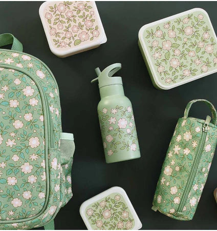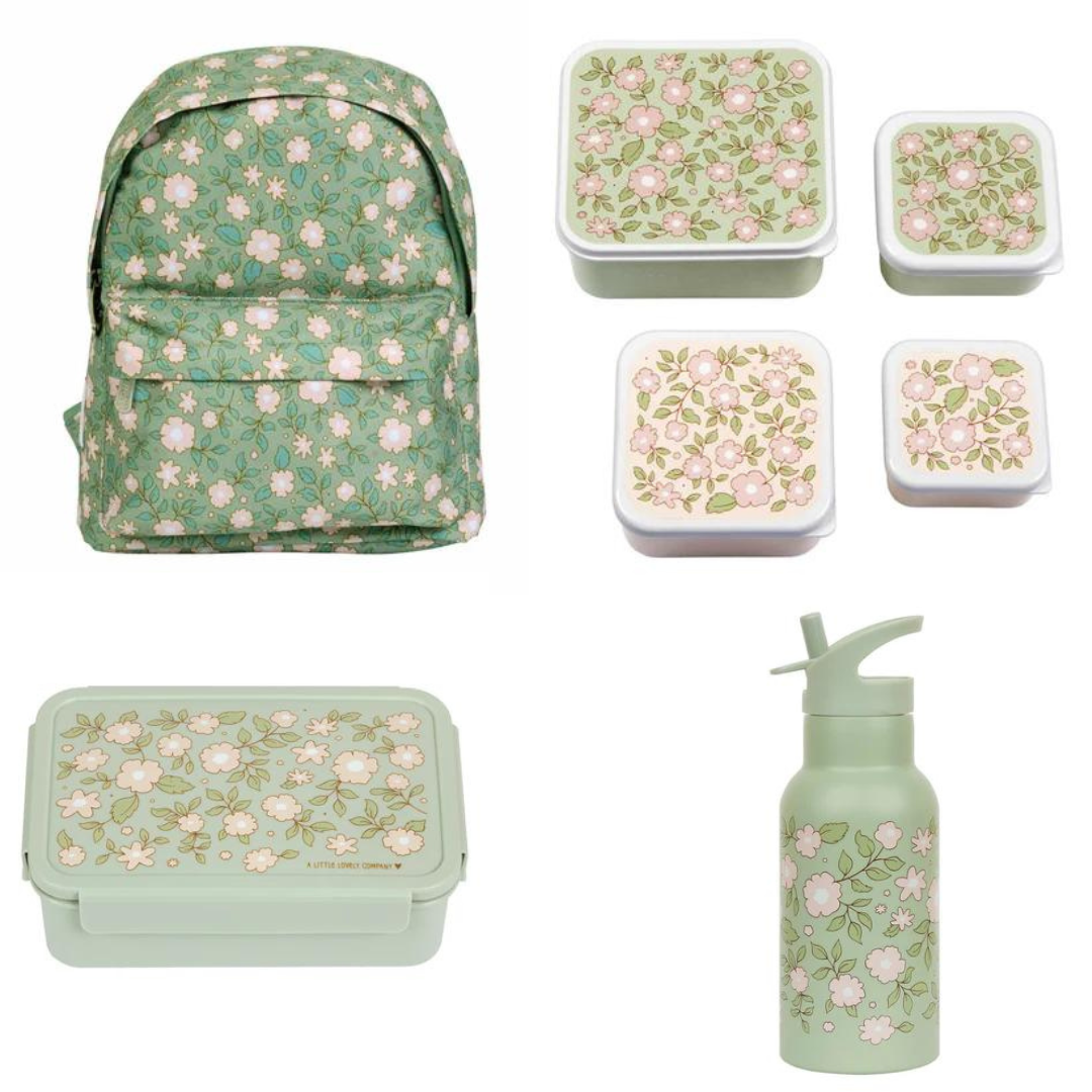 BEAU by Bo A Little Lovely Company Back to school set - Rugzak/Drinkfles RVS/4 Snackdozen/Bentobox - Bloesems Saliegroen