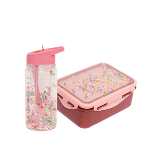 Een leuke drinkfles en bentobox met bewegende bolletjes.