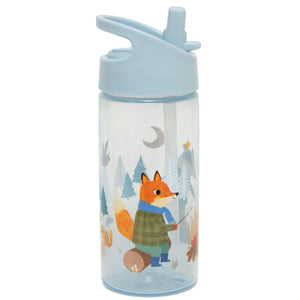Blauwe transparante fles met vreugdevuurdieren, een vos en een wasbeer, deze drinkfles heeft een inhoud van 380 ml, PP fles, deksel en tuit.