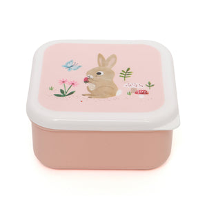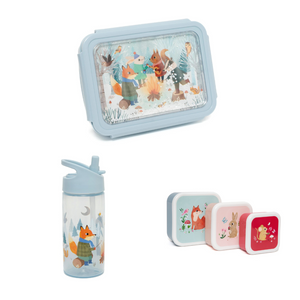 Een leuke bentobox, drinkfles en set van 3 snackdozen met bosdiertjes.