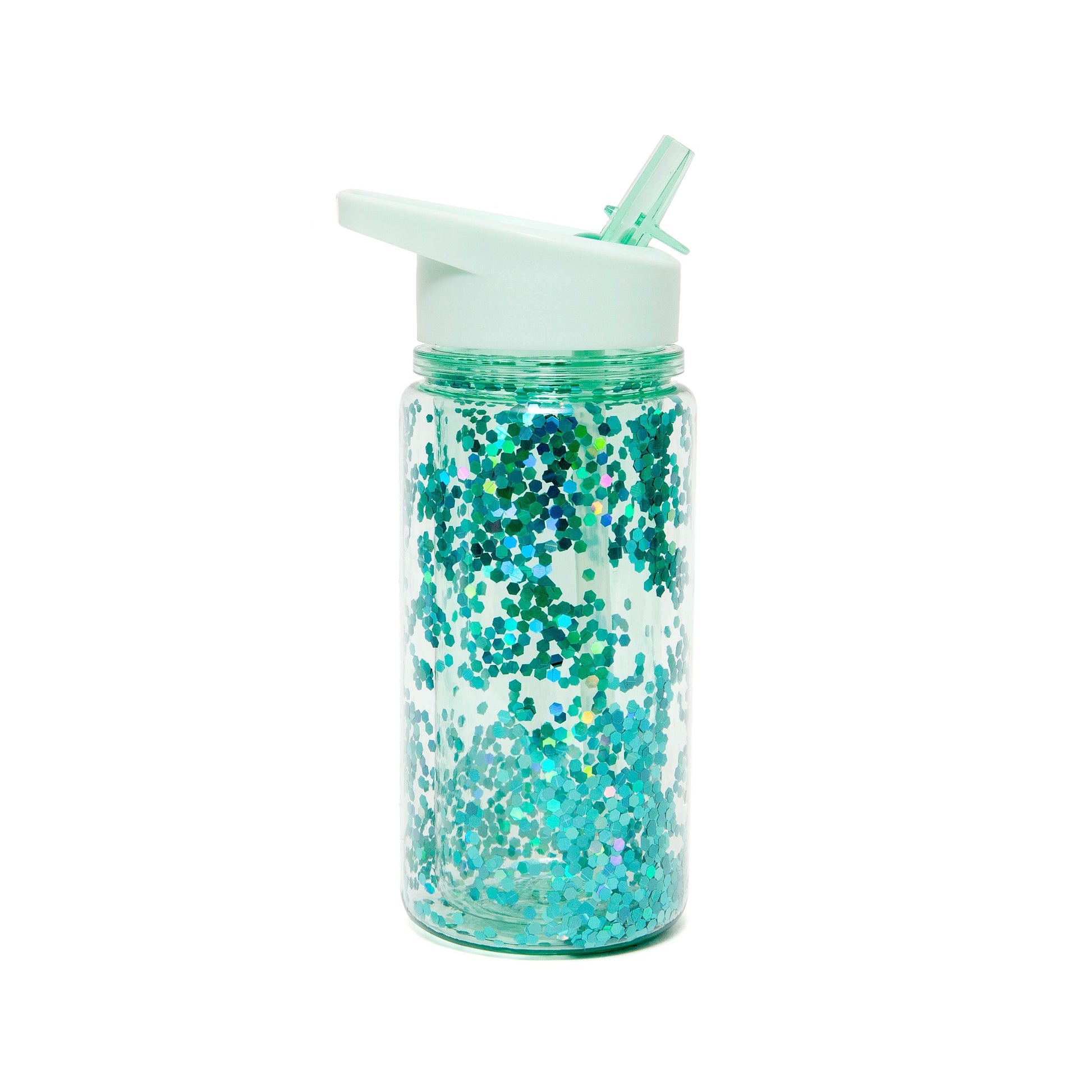 Dubbellaagse transparant flesje met groen gekleurde glitters. Fles heeft een inhoud van 300ml, tritan fles + PP deksel + rietje.