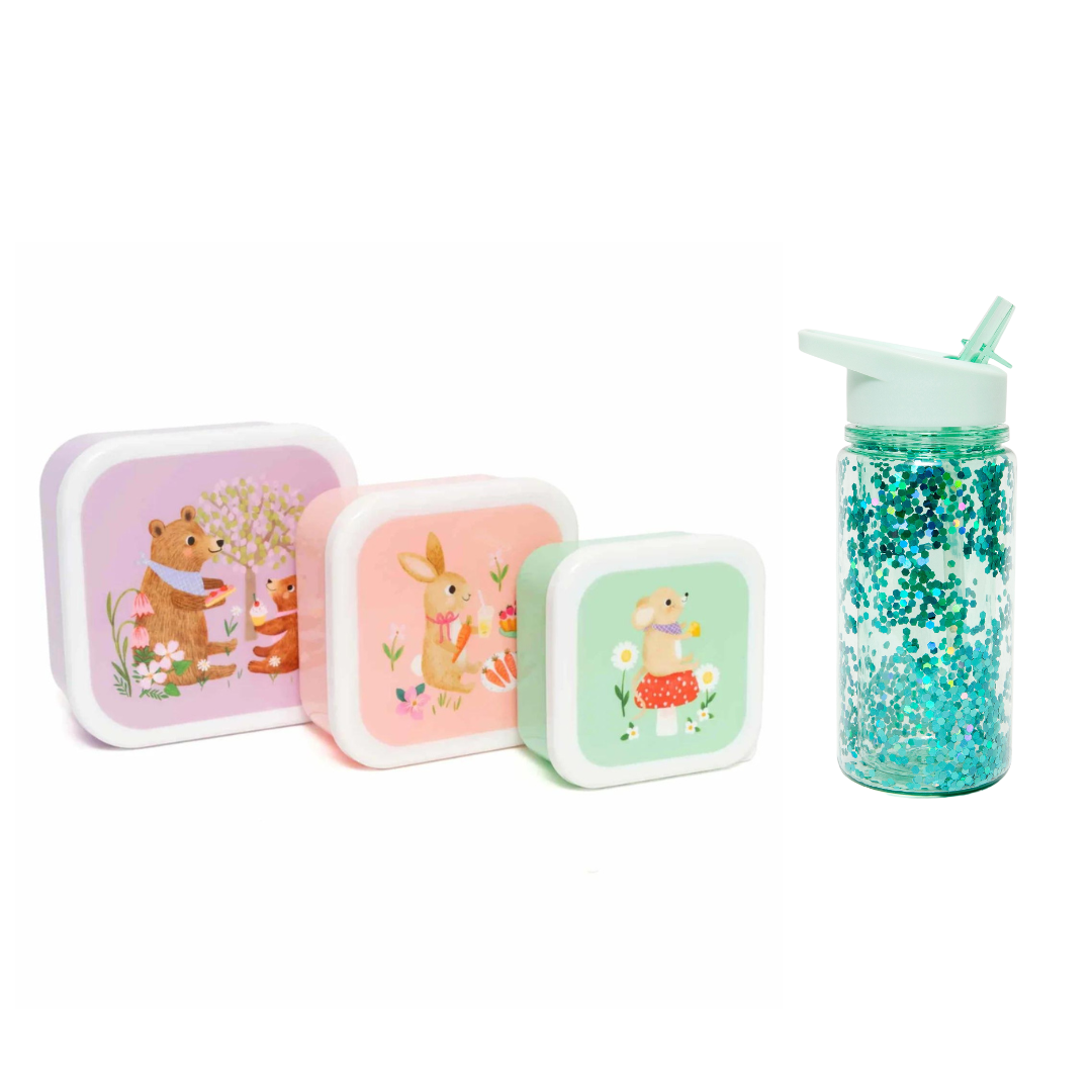 Een leuke drinkfles en set van 3 snackdozen met bosdiertjes.