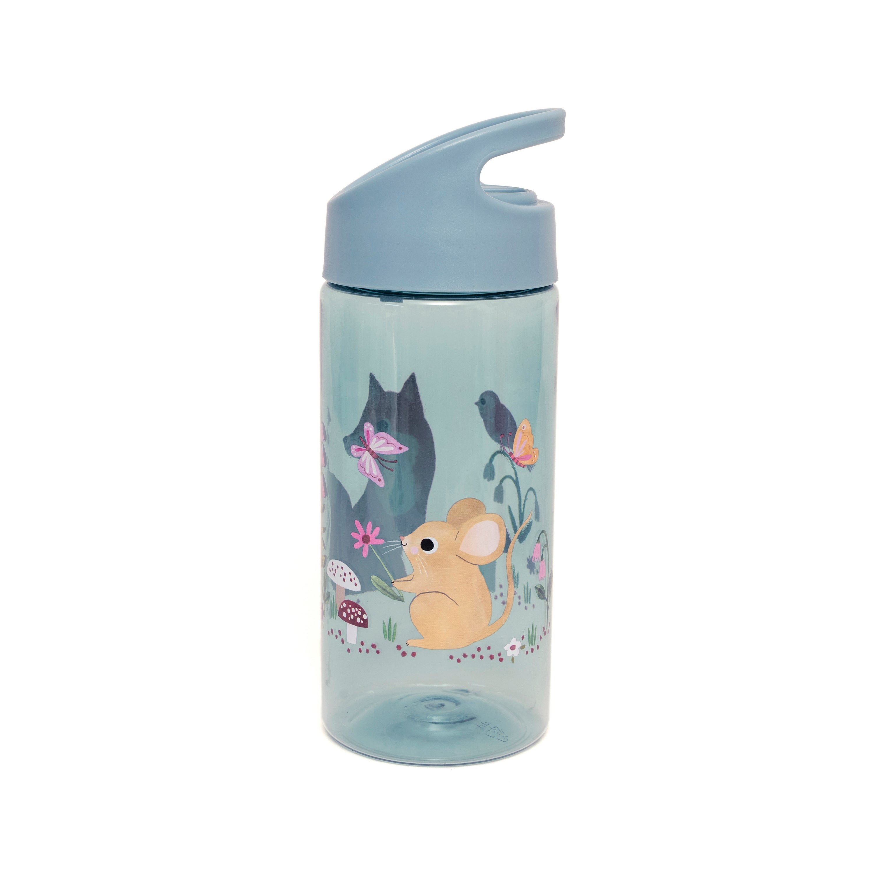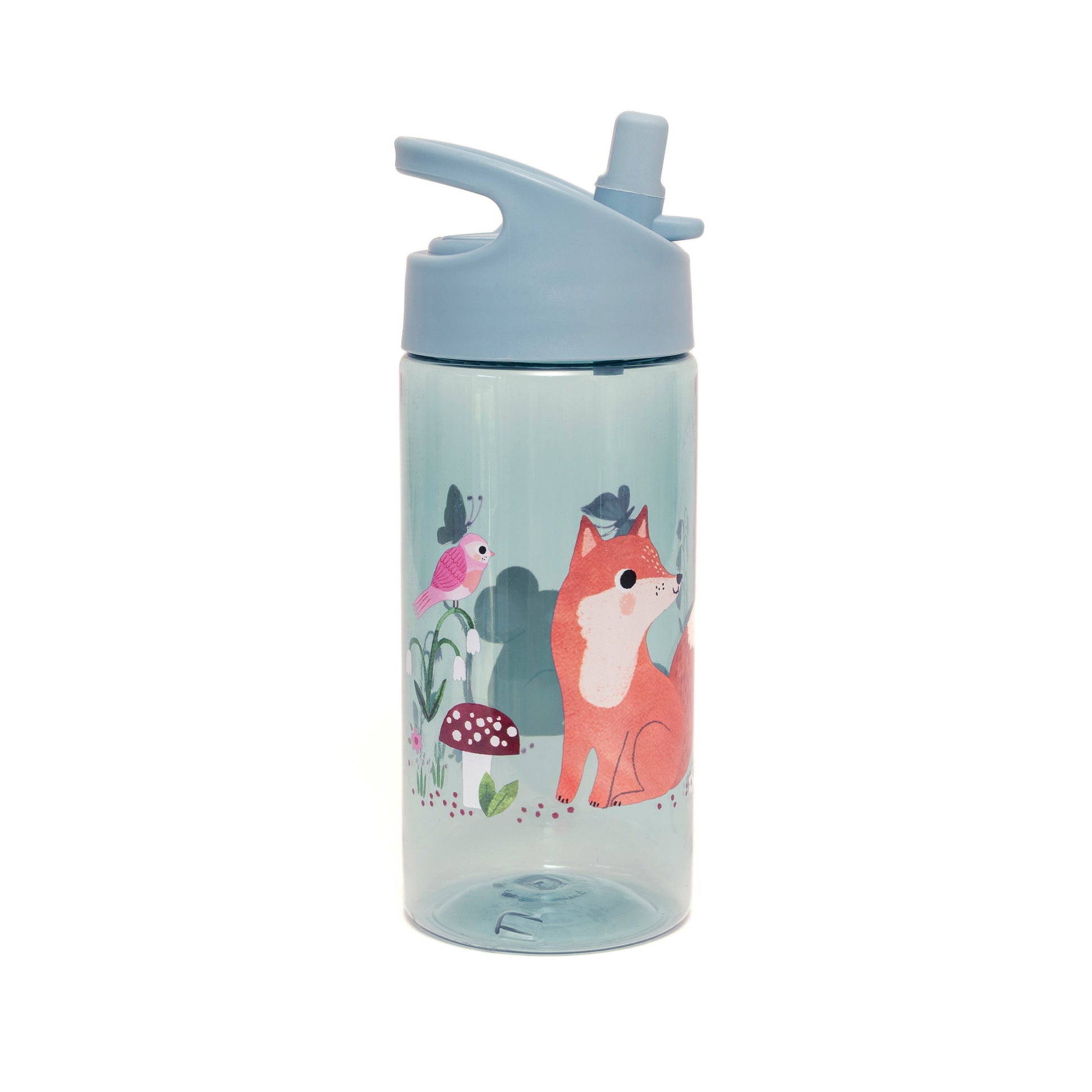 Blauwe transparante fles met vreugdevuurdieren, een vos en een wasbeer, deze drinkfles heeft een inhoud van 380 ml, PP fles, deksel en tuit.