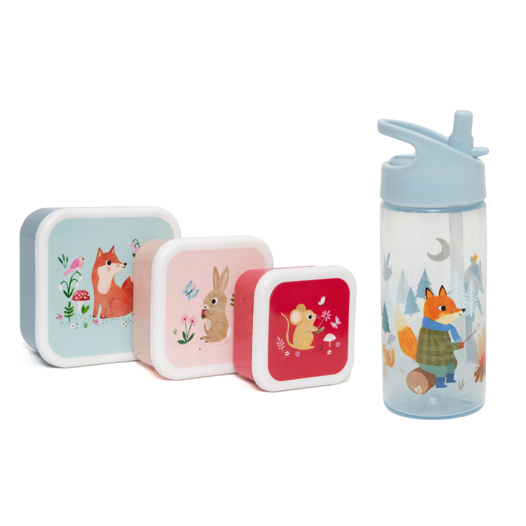 Een leuke drinkfles en set van 3 snackdozen met bosdiertjes.