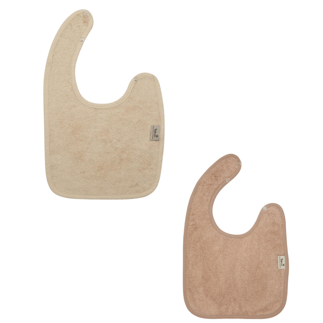 Praktische zachte Timboo - bamboeslab, geschikt om kleding te beschermen. Door de twee drukknopen kan de slab in twee verschillende standen dicht gemaakt worden, waardoor ze zowel voor baby's als peuters heel goed past.