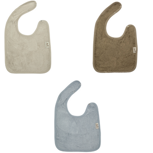 Praktische zachte Timboo - bamboeslab, geschikt om kleding te beschermen. Door de twee drukknopen kan de slab in twee verschillende standen dicht gemaakt worden, waardoor ze zowel voor baby's als peuters heel goed past.