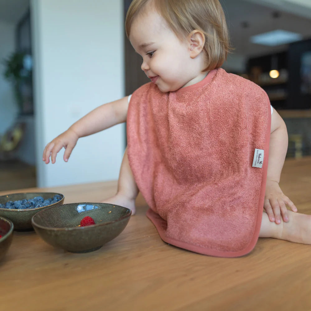Praktische zachte Timboo - bamboeslab, geschikt om kleding te beschermen. Door de twee drukknopen kan de slab in twee verschillende standen dicht gemaakt worden, waardoor ze zowel voor baby's als peuters heel goed past.