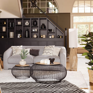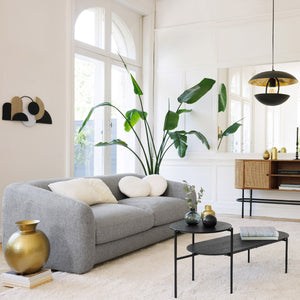 In een Scandinavische sfeer voeg je een salontafel met houten poten en een grote vaas met gedroogde bloemen toe.
