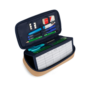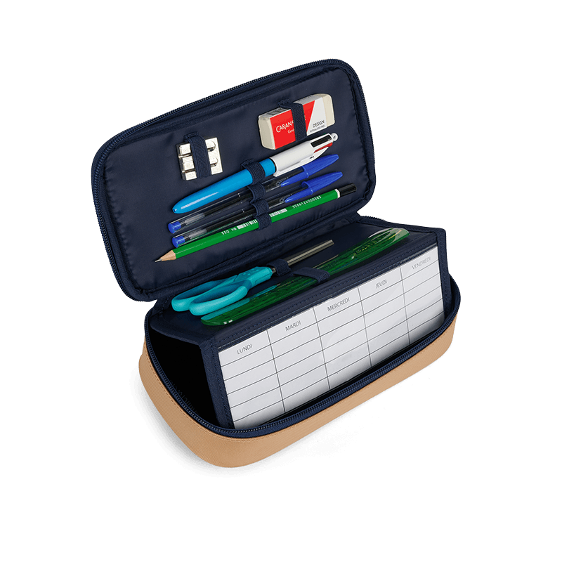 Het eerste compartiment is ideaal voor pennen, potloden, gummen, puntenslijpers en linialen (tot 20 cm).