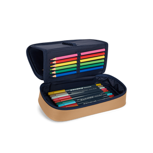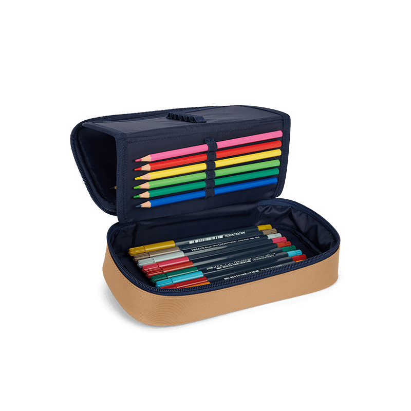 Het tweede compartiment biedt voldoende ruimte voor kleurpotloden, viltstiften of andere omvangrijke benodigdheden. Elk compartiment is volledig gevoerd voor optimale weerstand tegen wrijving en stoten.