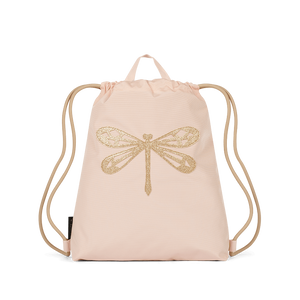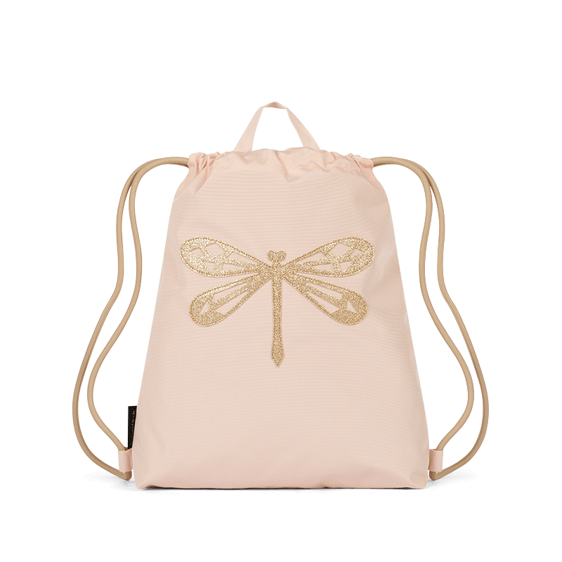 Kleine roze tas met een delicaat libelmotief, de perfecte 'sporttas' om sportspullen in mee te nemen of om als extra tas te gebruiken. Dankzij het magische trekkoordje kan hij over één of beide schouders worden gedragen!