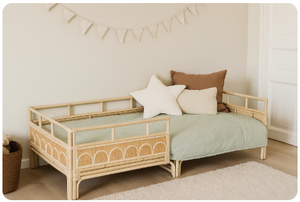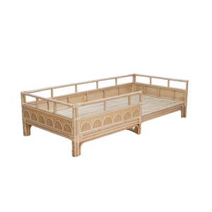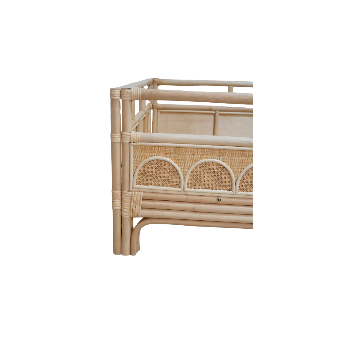 Laat dromen tot leven komen met dit handgemaakte rotan bed. De warme naturel kleur en speelse details maken het bed tot een echte blikvanger in elke kinderkamer. Dankzij de afneembare valbescherming is het bed perfect geschikt voor kleine dromers én voor ouders die graag meegroeien met hun kind.