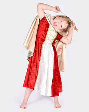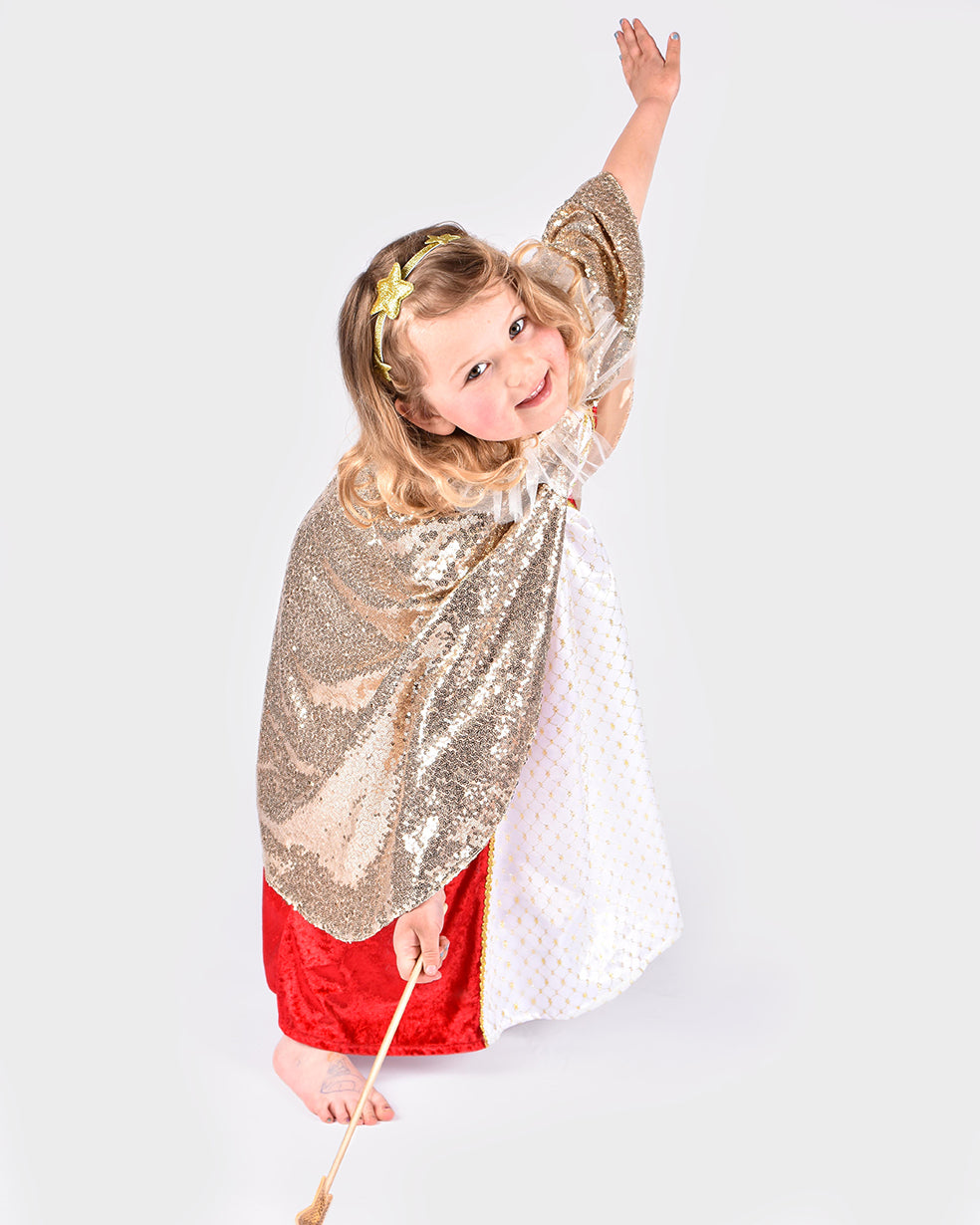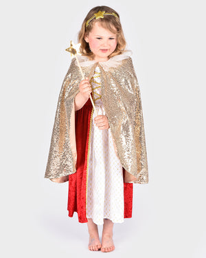 Gouden set inclusief met lovertjes bedekte cape met klittenbandsluiting aan de voorkant, met satijn en lovertjes bedekte toverstok en hoofdband met gouden glittersterren.