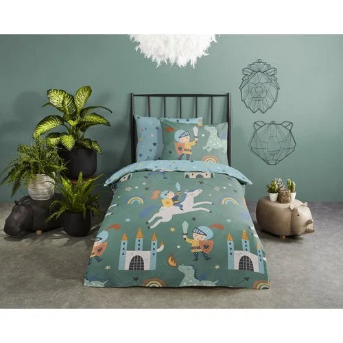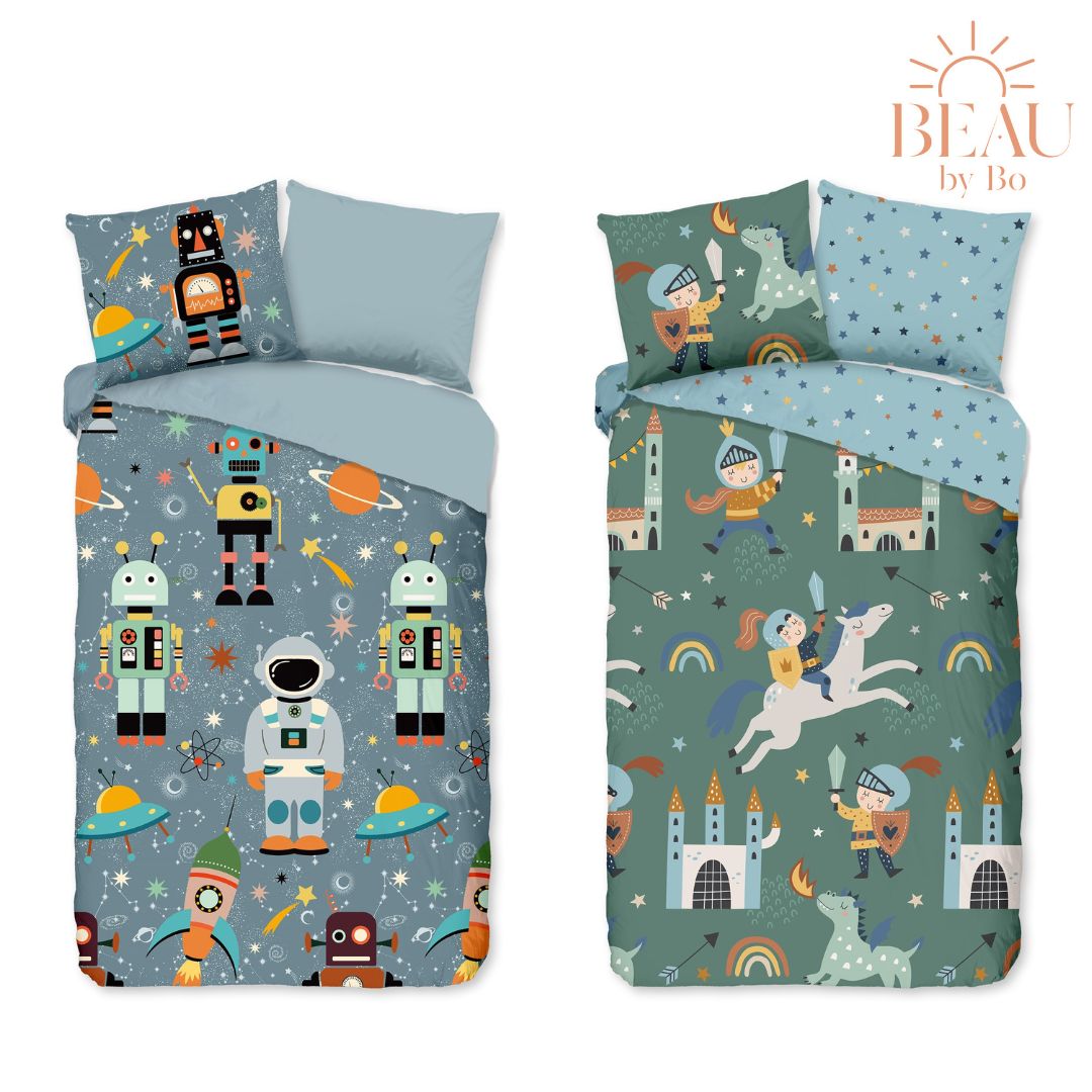Ontdek betoverende nachten met onze prachtige set dekbedovertrekken met ridder- en astronautenprint. Deze hoogwaardige overtrekken zijn vervaardigd uit zacht katoen, waardoor ze niet alleen heerlijk aanvoelen, maar ook duurzaam en ademend zijn. De dubbelzijdige print biedt veelzijdigheid, waardoor je eenvoudig de sfeer in je slaapkamer kunt veranderen. Laat je meevoeren naar een magische wereld vol kleur en comfort met deze betoverende dekbedovertrekken. Perfect voor dromers van alle leeftijden!