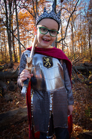 Word een echte ridder van de ronde tafel met deze zilveren riddertuniek en prachtige roodfluwelen cape!