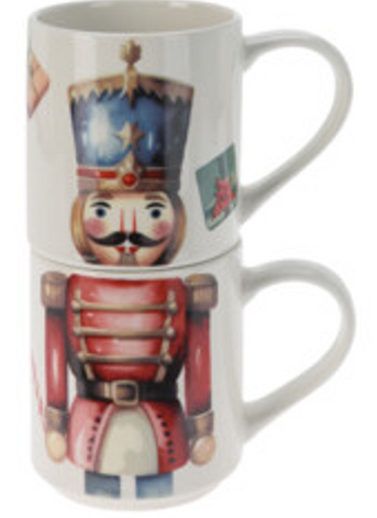 De set bevat 2 keramieken mokken (265 ml) met verschillende kerstprints – van een vrolijke kerstman tot feestelijke sokken, zuurstokken en winterse details.