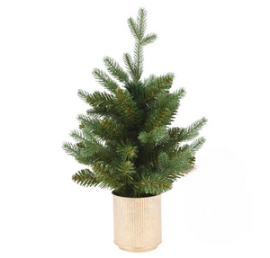 Een kerstboom hoeft niet altijd groot te zijn om veel sfeer te kunnen creëren. Dat bewijst deze kleine kunstkerstboom in gouden pot van 60cm hoogte. De kunstkerstboom bestaat uit twee soorten naalden; PVC naalden met platte, borstelachtige naalden voor een vol geheel en PE naalden die middels een mal van echt dennengroen gevormd zijn en een natuurlijke uitstraling aan de boom geven. Het gouden potje is gemaakt van zink met een hoogte 14,5cm en een diameter van 13cm en is verstevigd met cement. Vouw de takken mooi uit, versier het boompje met kerstlampjes en kerstballetjes naar keuze. Plaats de kunstkerstboom op het dressoir, naast de tv of een ander mooi plekje in huis en geniet van de kerstsfeer.