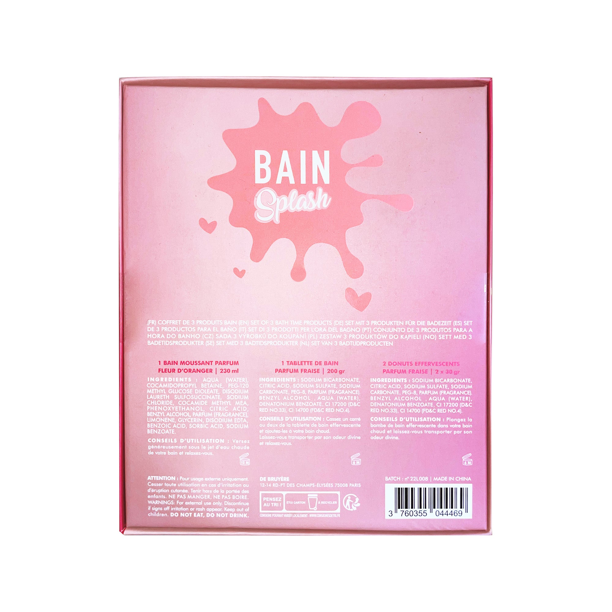 Splash Bath Set, bestaande uit een zoet bubbelbad met vanille-donutgeur, een bruistablet met bosbessen en twee donuts!