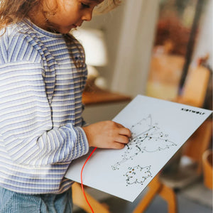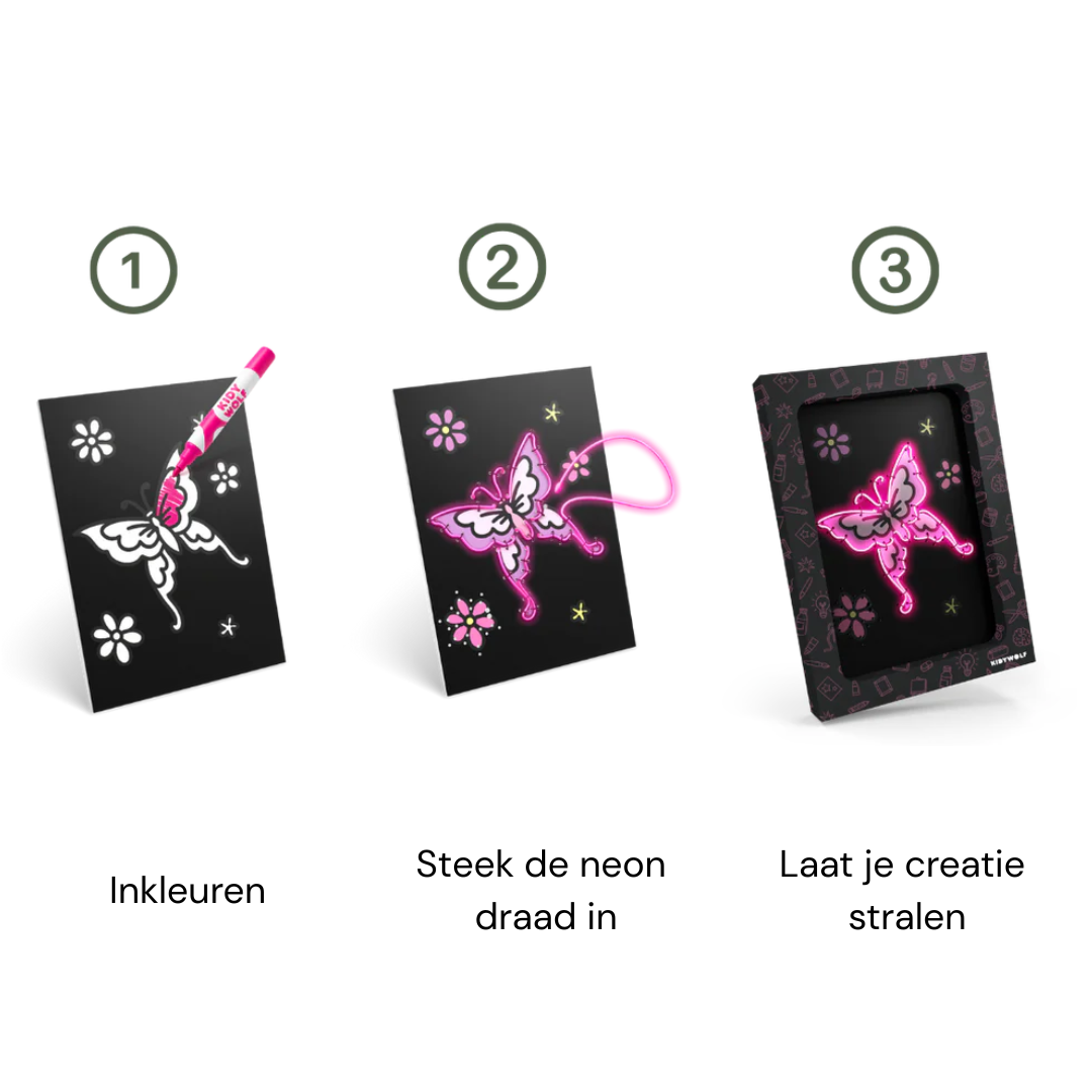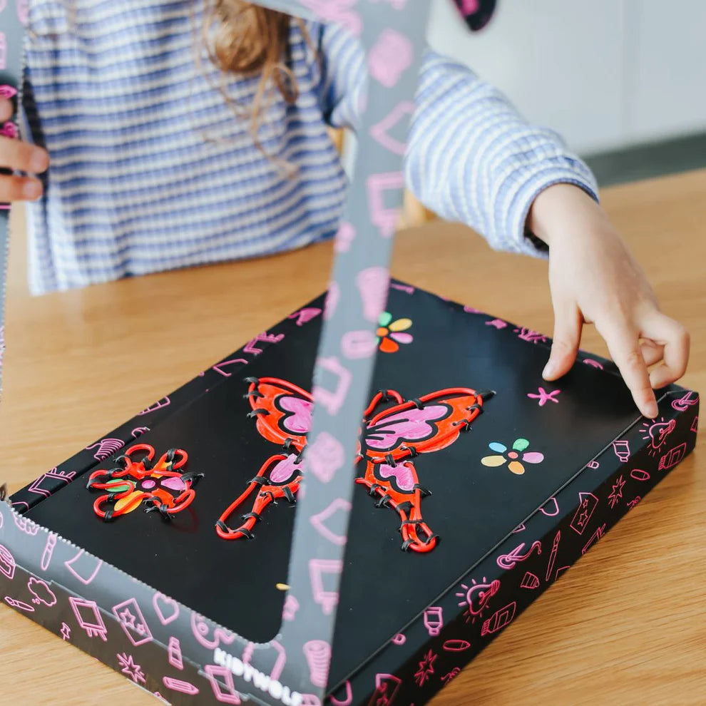 KIDYNEON geeft creatieve hobby's een nieuwe dimensie door er een vleugje magische verlichting aan toe te voegen! Met behulp van neonkleurige draad die in een voorgeperforeerd bord wordt bevestigd, maken kinderen schitterende, originele kunstwerken die ze trots kunnen tentoonstellen. Een handvaardige activiteit die de creativiteit stimuleert en tegelijkertijd de fijne motoriek en concentratie ontwikkelt. Zonder scherm, 100% boeiend!