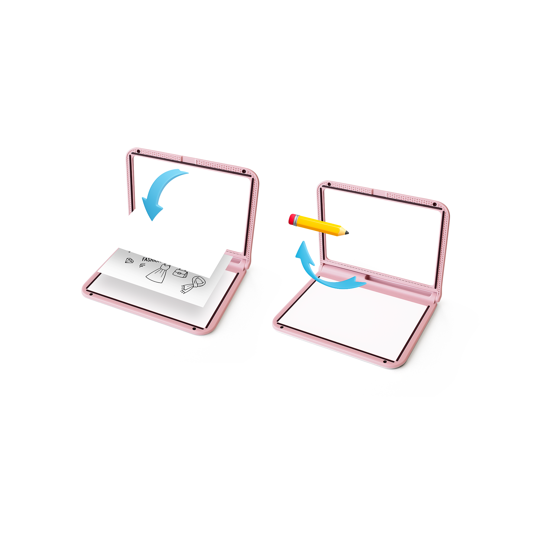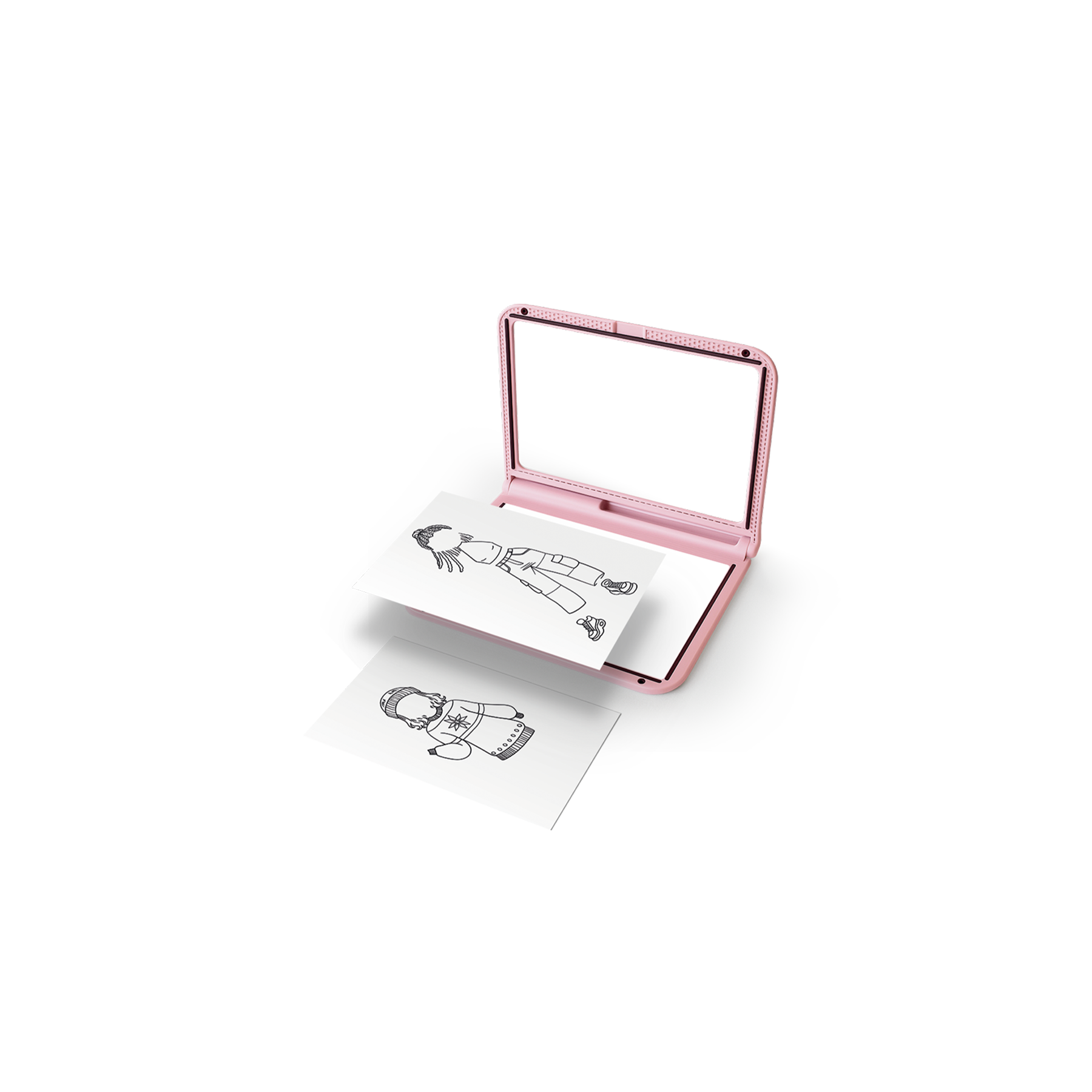 Met KIDYDRAW PRO worden kinderen echte stylisten in spe. Dankzij een ingenieus systeem van stickers kunnen ze silhouetten, outfits, accessoires en motieven eindeloos combineren – meer dan 1000 combinaties zijn mogelijk, net als in een echt modeatelier. Het lichtbord is dubbelzijdig en biedt ruimte voor vrije, leuke en creatieve expressie.